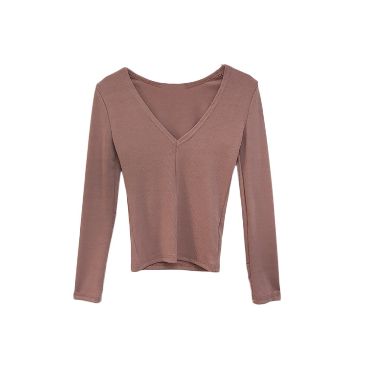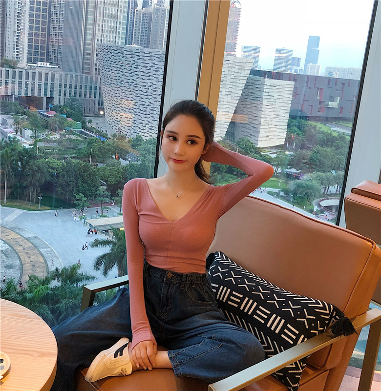 / 秋天上衣女時尚韓版深V領性感純色長袖T恤修身顯瘦打底長袖T恤潮