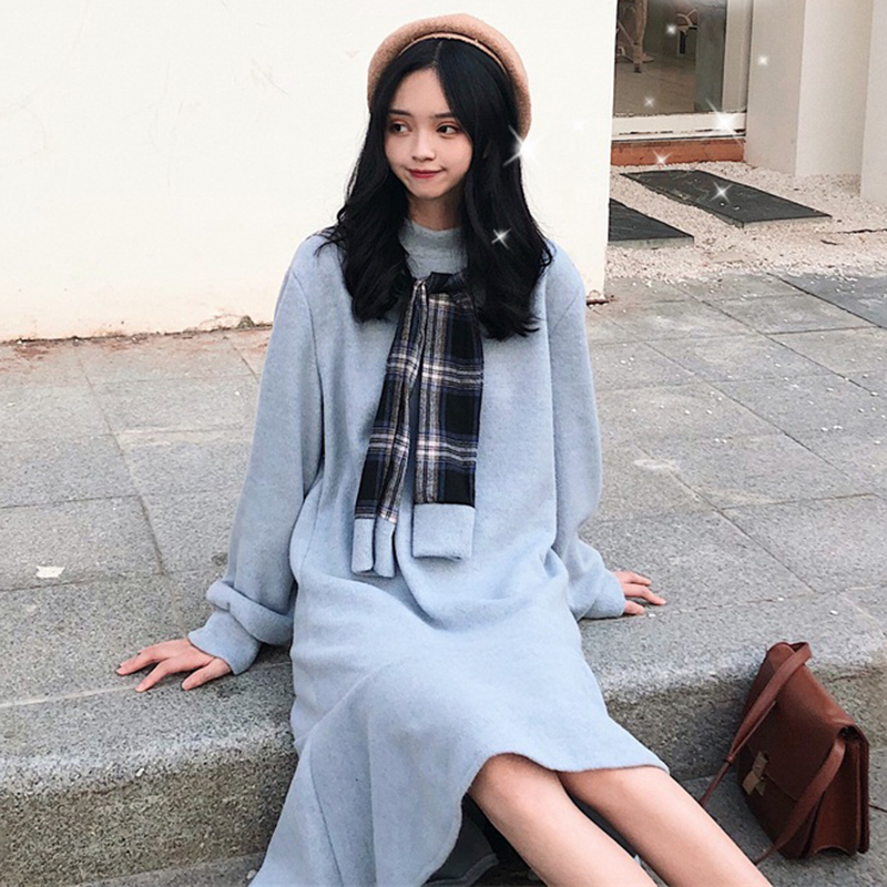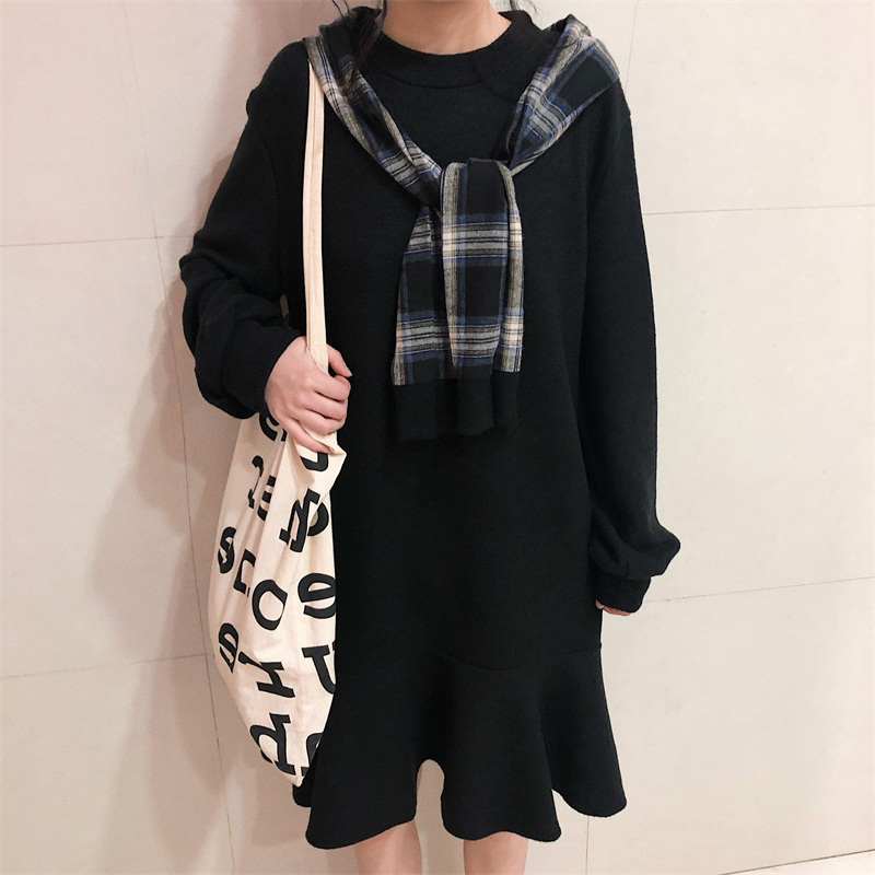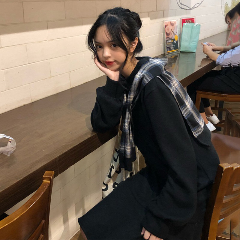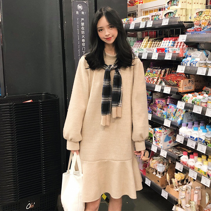秋冬女裝2018新款韓版寬松魚尾裙子學生休閑衛衣連衣裙配格子披肩