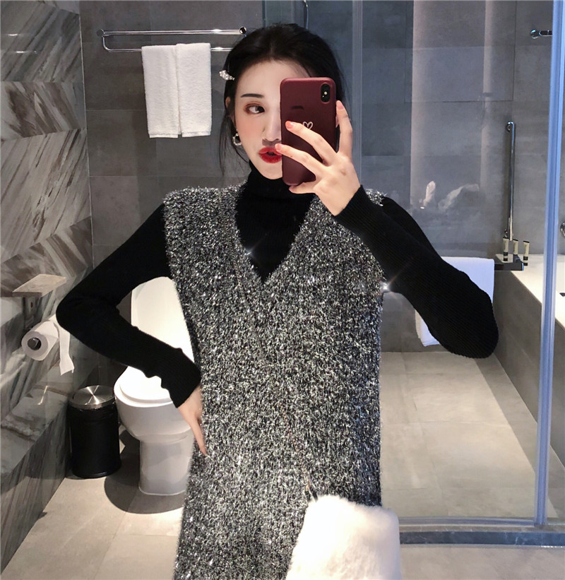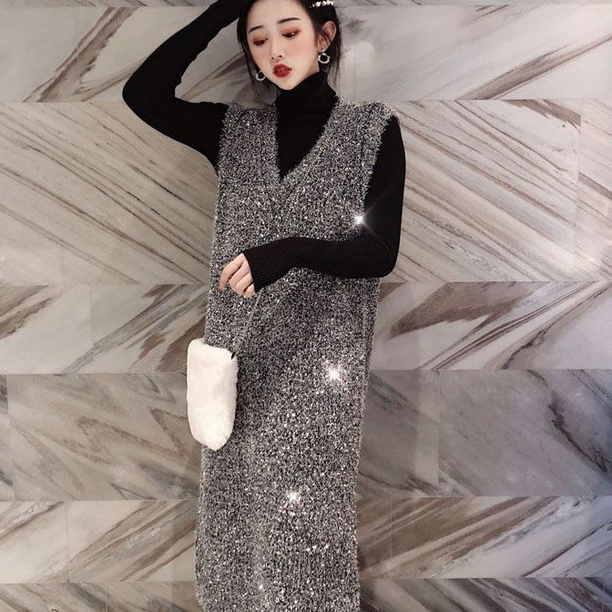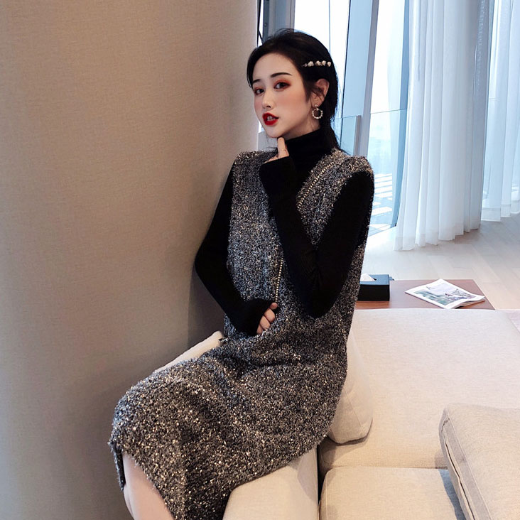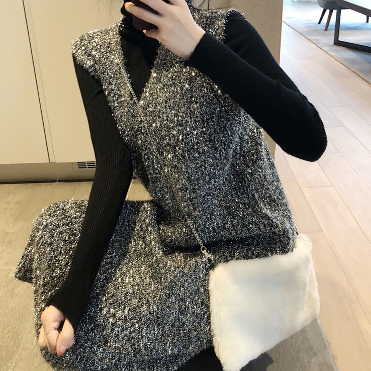 / 復古港味秋裝女2018新款套裝蹦迪閃亮背心長裙+百搭修身打底上衣