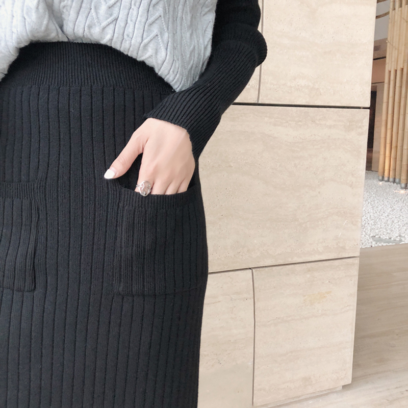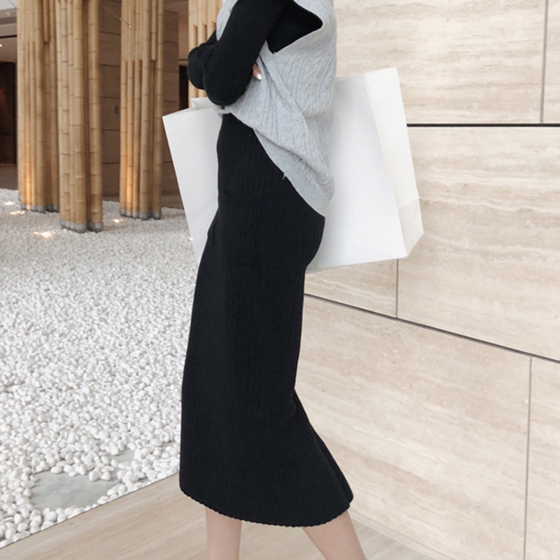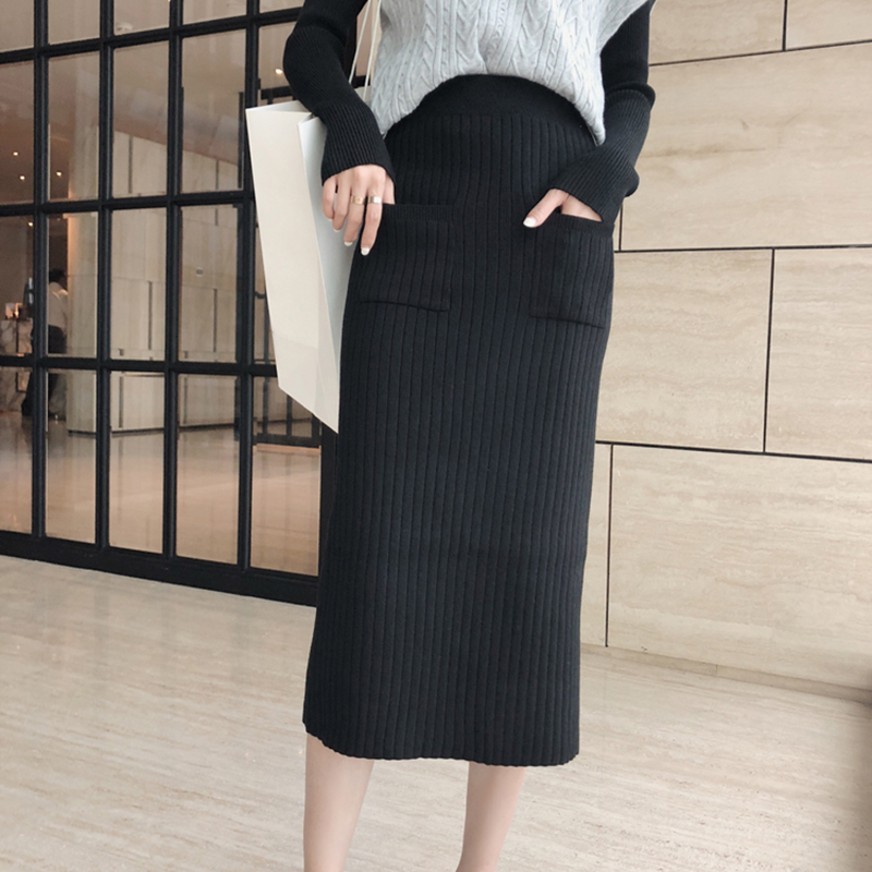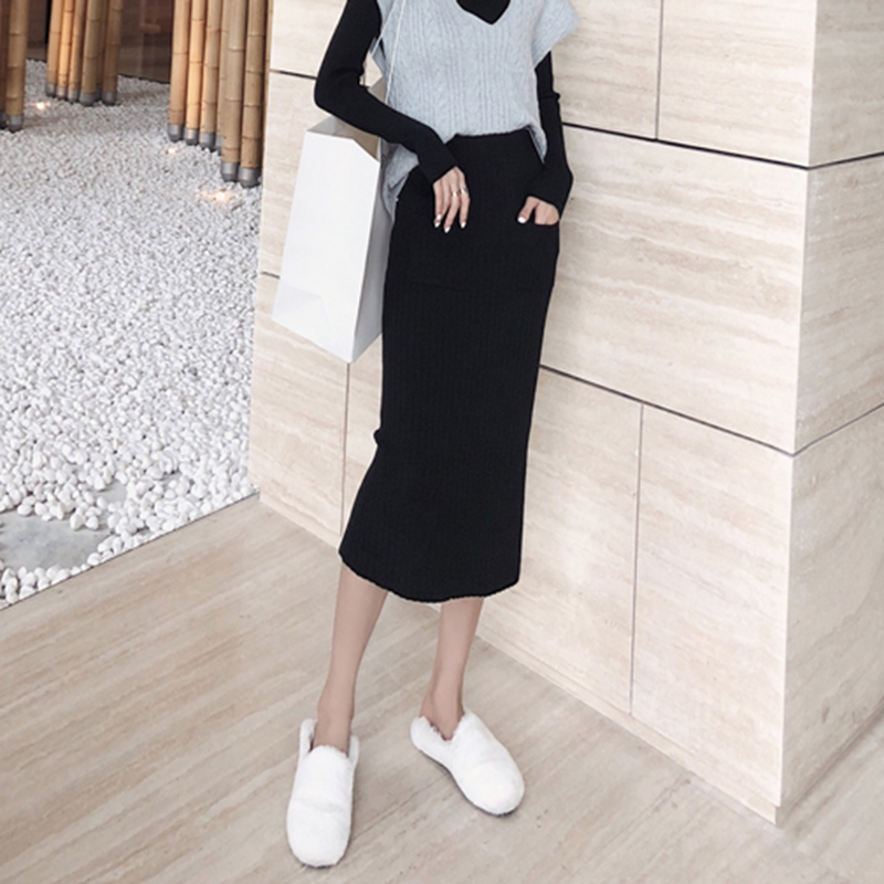 秋冬女裝2018新款復古風開叉黑色針織中長裙高腰顯瘦包臀半身裙子