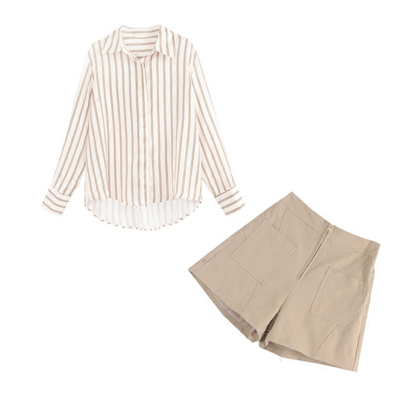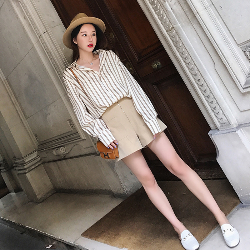 / 晚晚風秋裝矮個子網紅小清新chic洋氣條紋襯衫配闊腿褲兩件套裝女