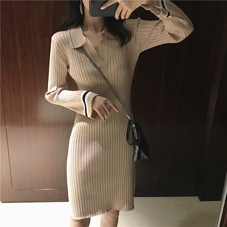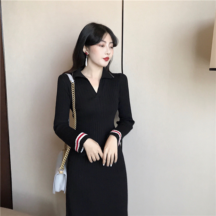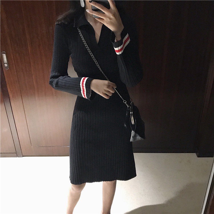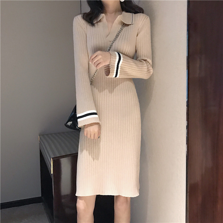 / 韓版chic早秋毛衣慵懶2018新款女氣質翻領中長款喇叭袖打底連衣裙