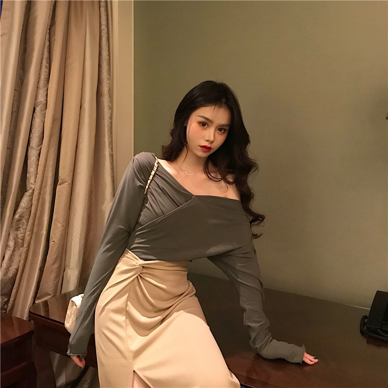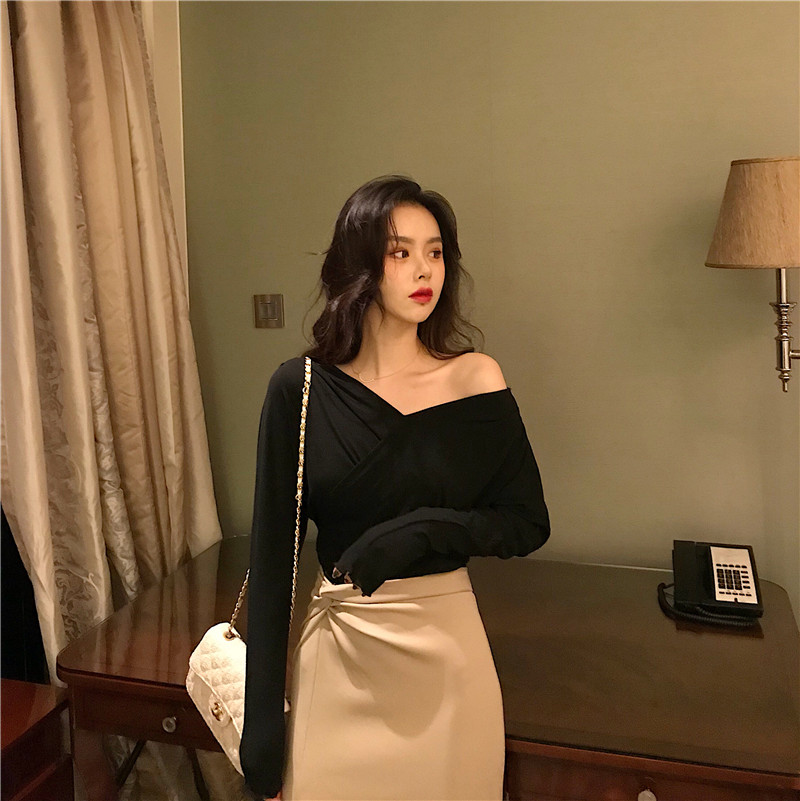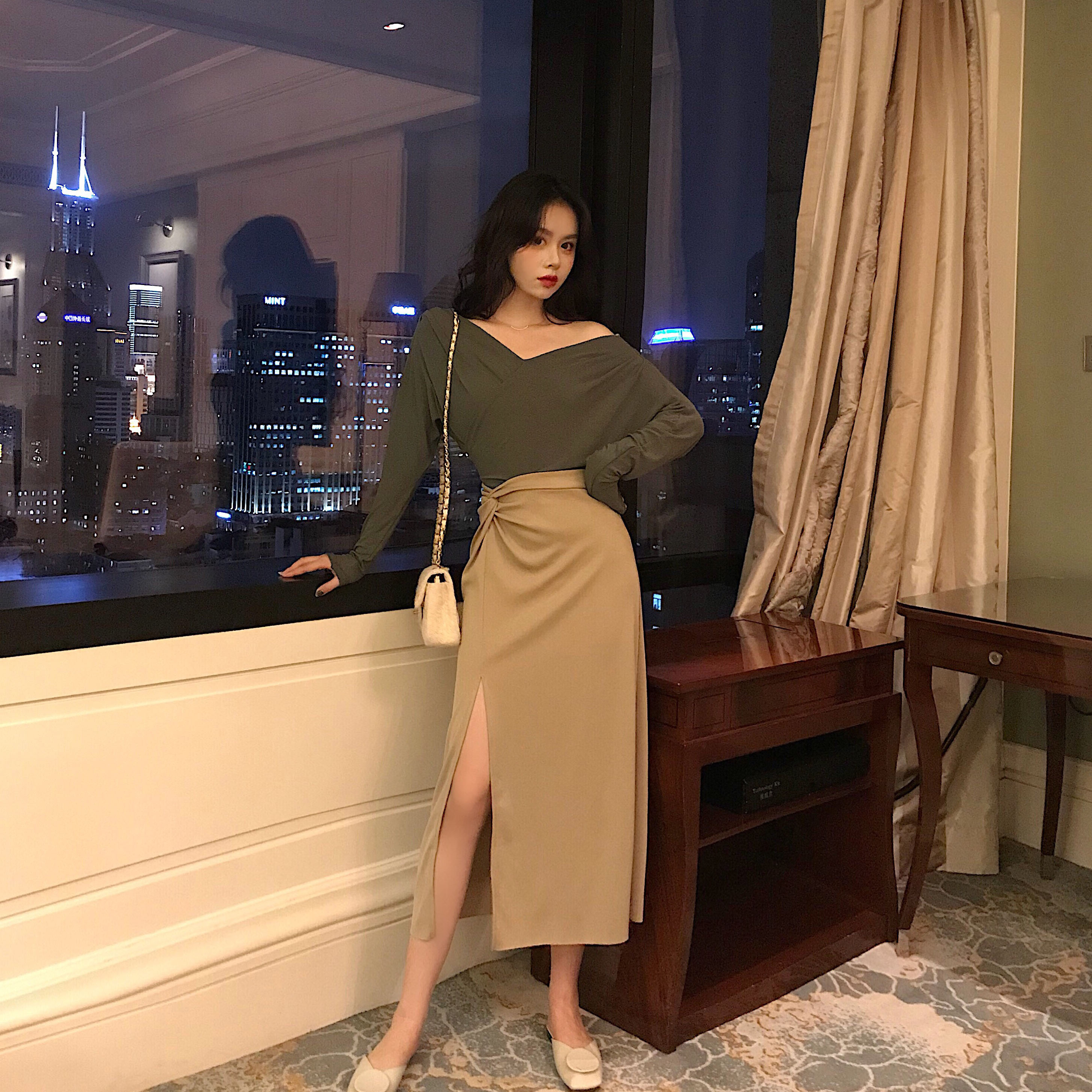 / 秋季套裝女時尚兩件套v領純色設計感長袖上衣女+打結包臀半身長裙
