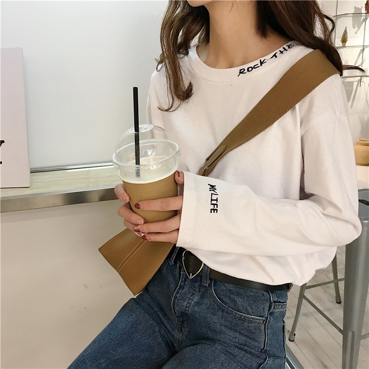 / 秋裝女裝韓版寬松復古簡約字母刺繡長袖純棉T恤學生上衣打底衫潮