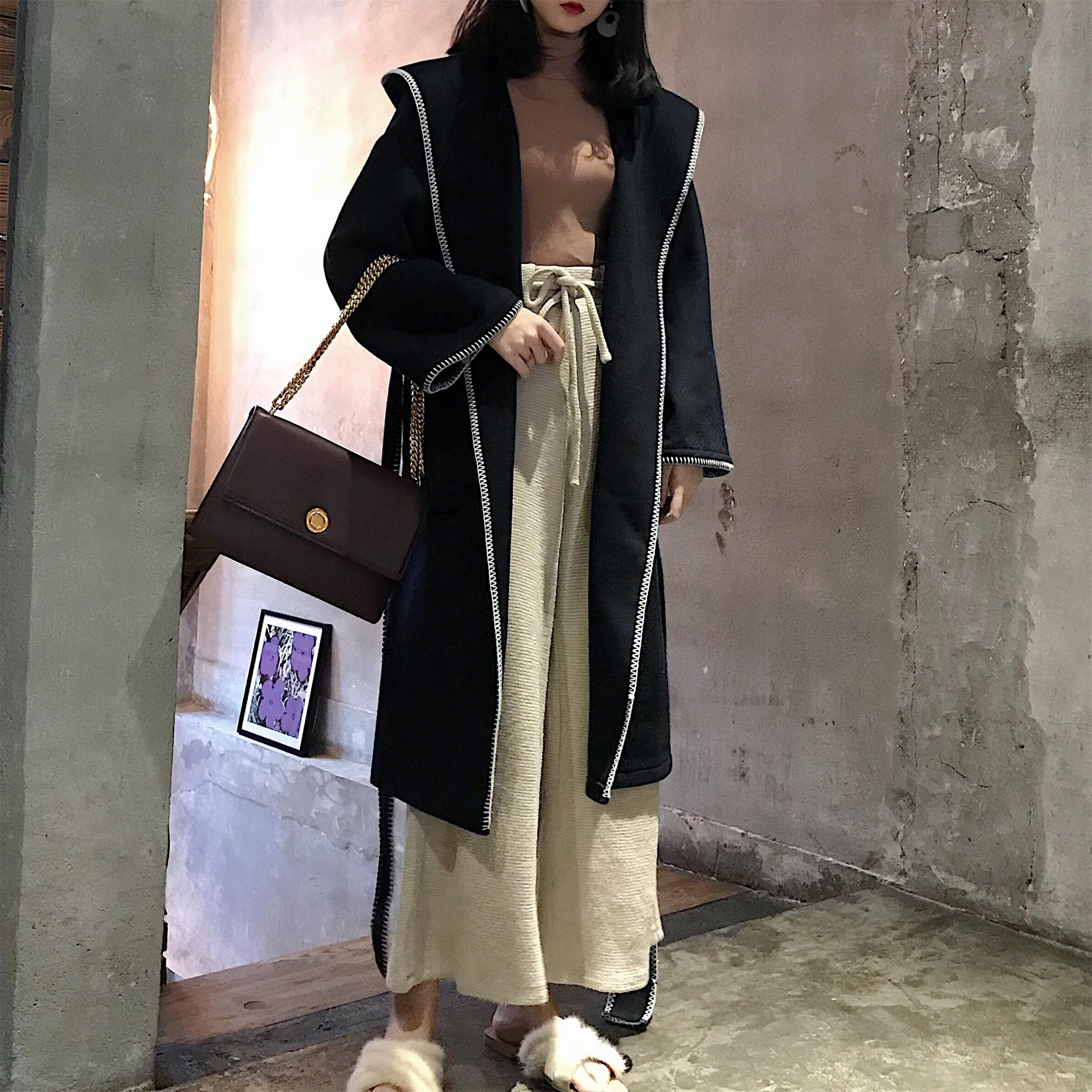 港風外套女冬裝2018新款寬松繡邊連帽系帶中長款毛呢外套大衣女潮
