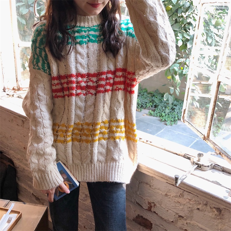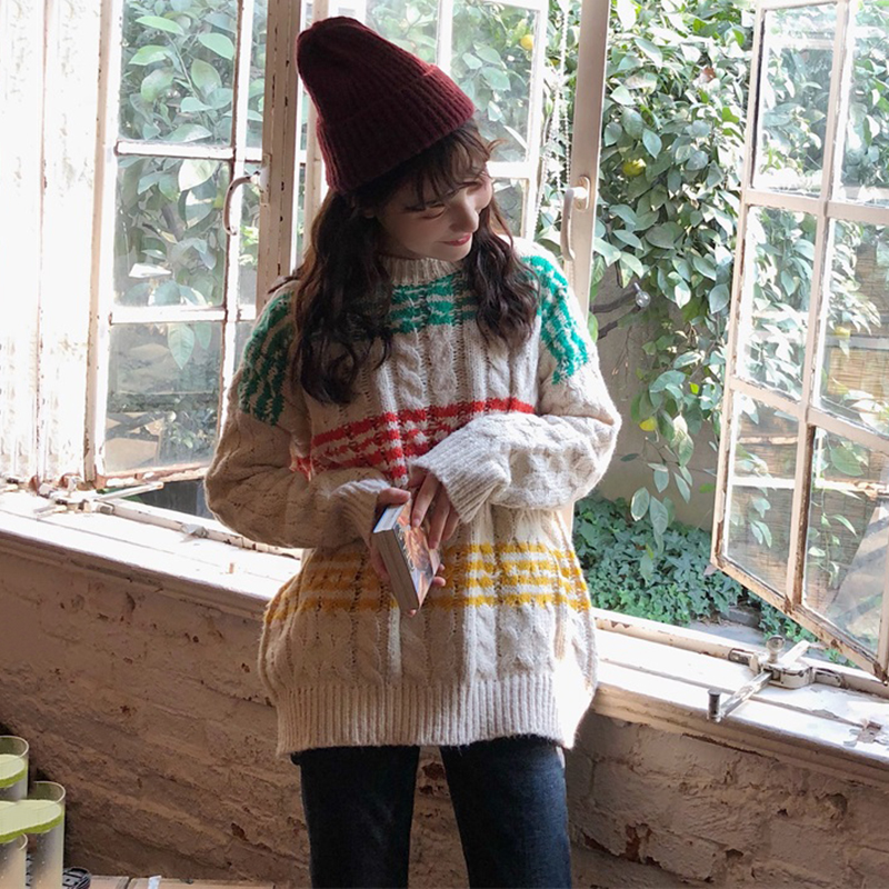 / 時尚拼色條紋毛衣女秋冬裝2018新款慵懶寬松針織外套休閑長袖上衣