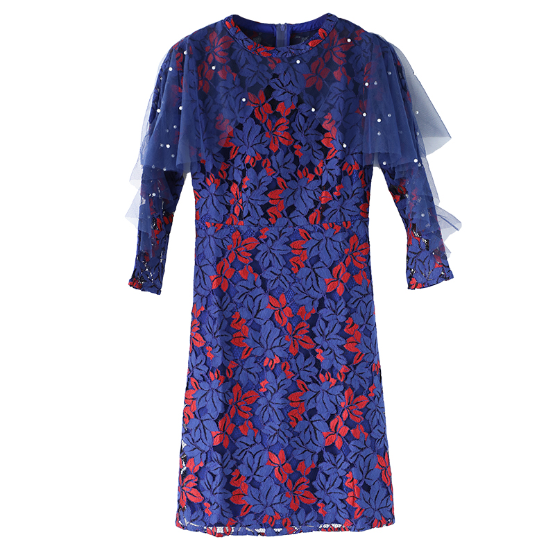 S秀女裝印花蕾絲連衣裙女2018夏季新款拼接顯瘦圓領七分袖中裙