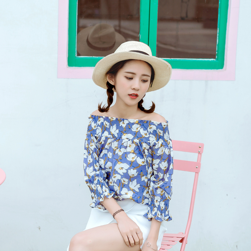 / 韓版夏裝新款甜美露肩一字領露肩碎花雪紡衫寬松小清新上衣潮