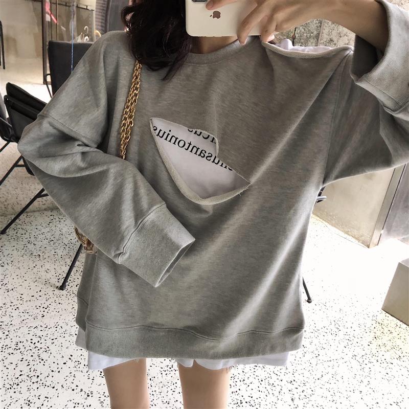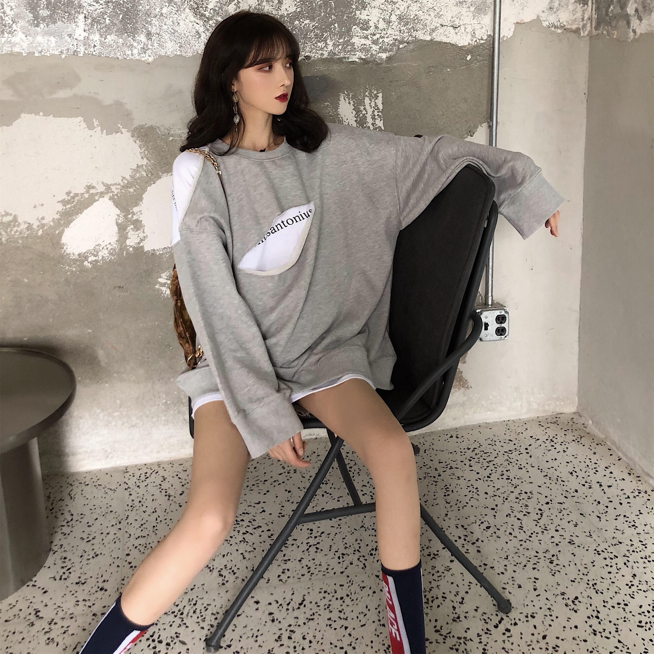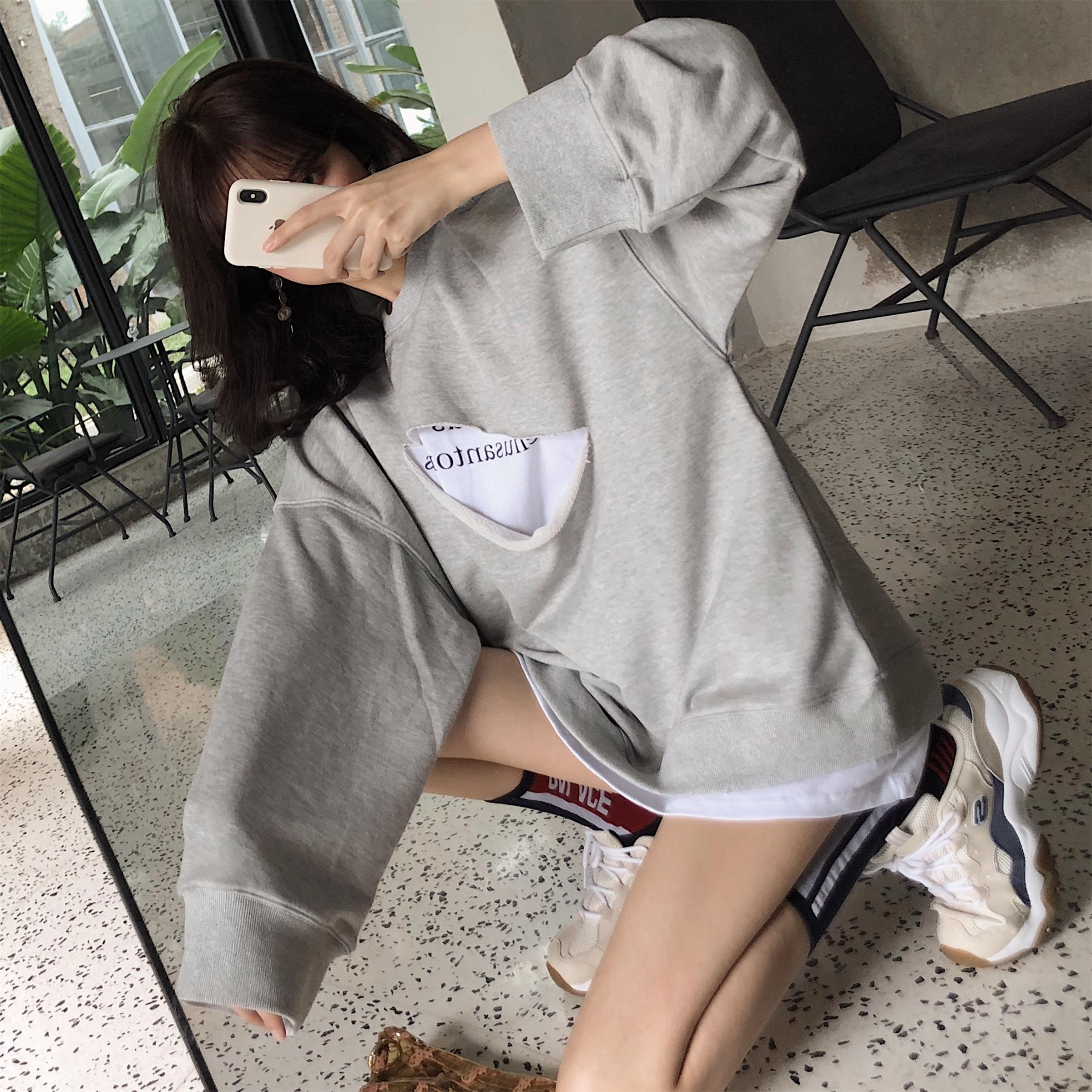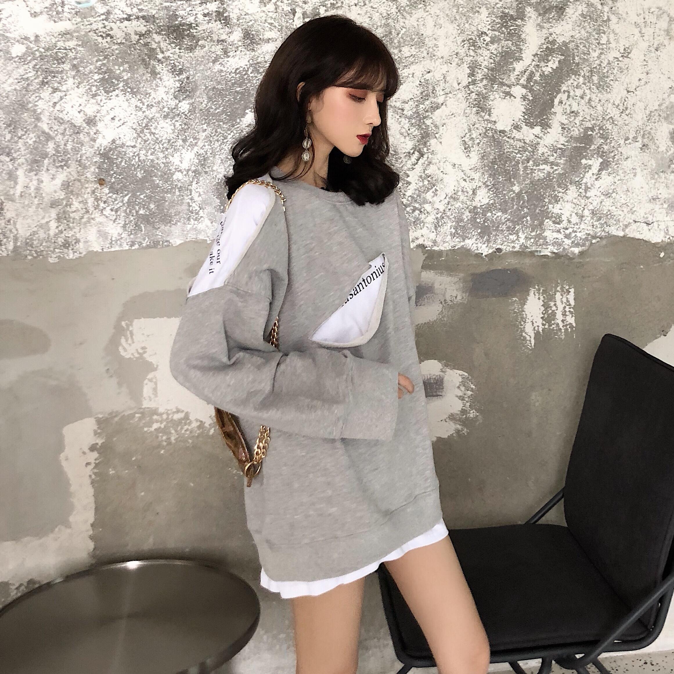 2018秋裝新款韓版氣質bf風寬松中長款chic風百搭假兩件套頭衛衣女