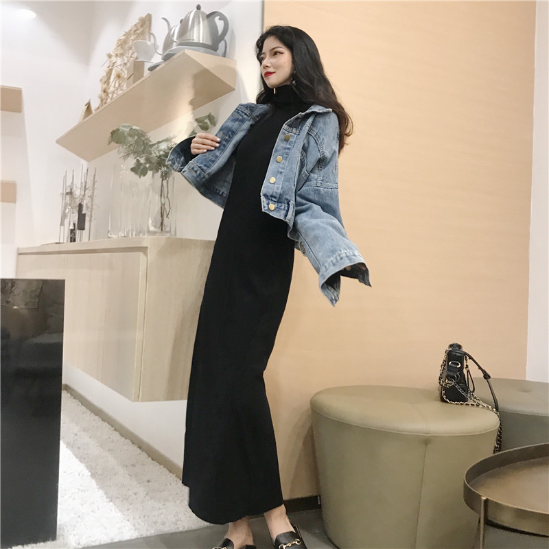 / 裙子女秋新款韓版chic寬松百搭過膝長裙后開叉高領長袖打底連衣裙