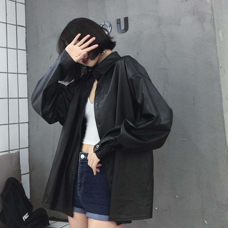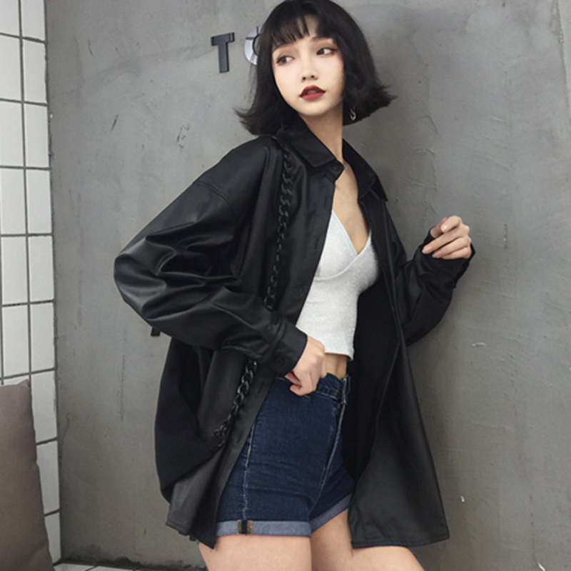 / 秋季新款復古港味oversize皮襯衫百搭上衣氣質時尚中長仿皮外套女