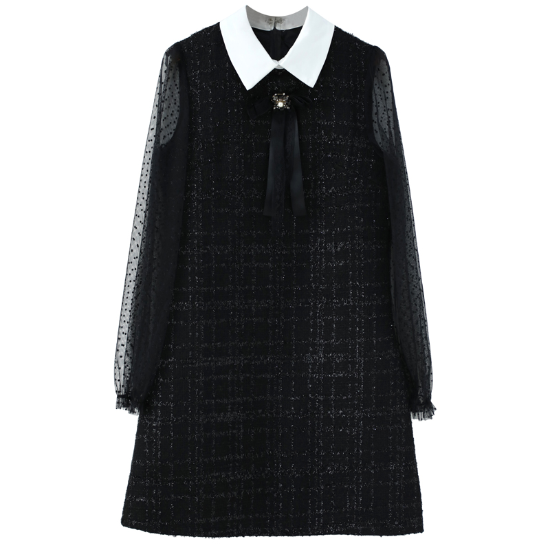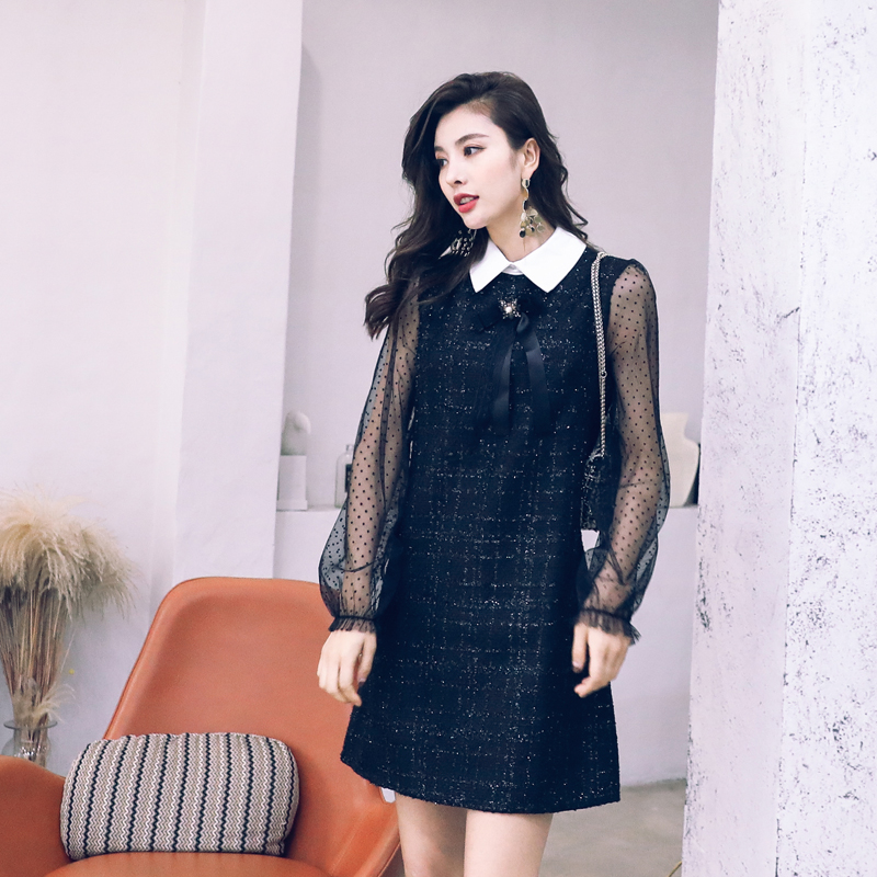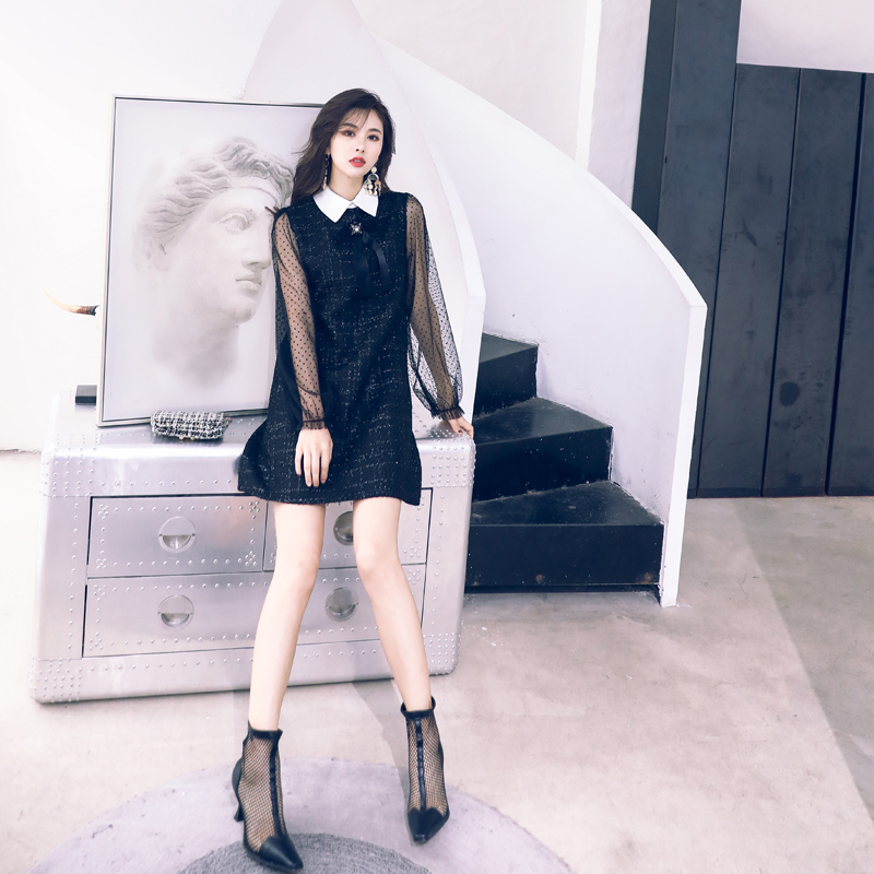 / 連衣裙女2018秋冬新款長袖a字裙網紗拼接港味初戀復古毛呢打底裙