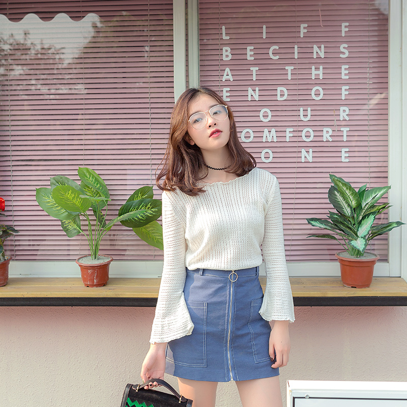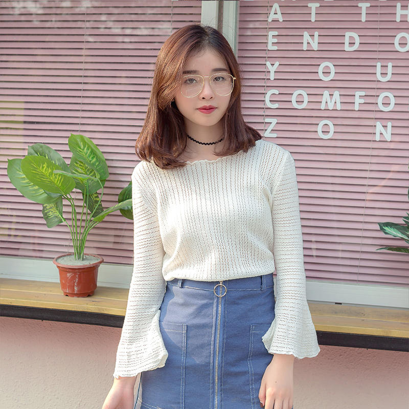 / 春裝新款女裝韓版顯瘦喇叭袖鏤空白色針織衫長袖打底衫上衣潮