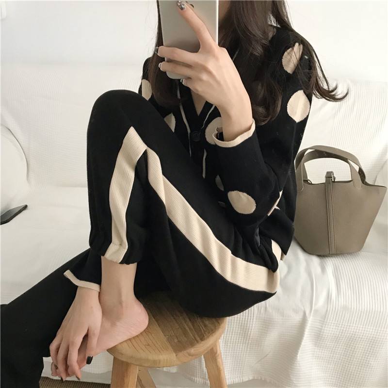 2018新款大波點v領針織衫兩件套寬松側條紋毛呢褲時尚套裝女