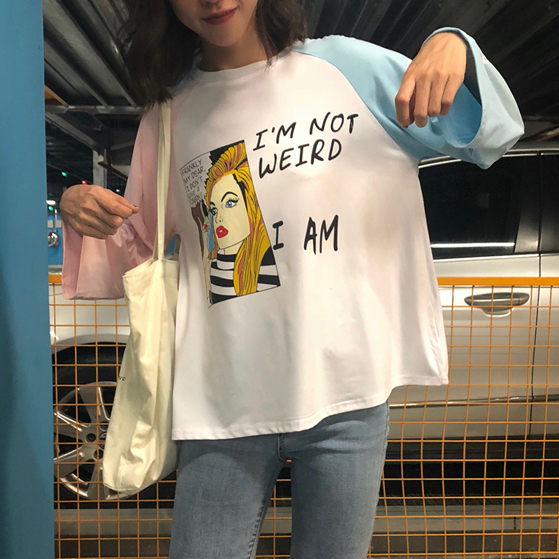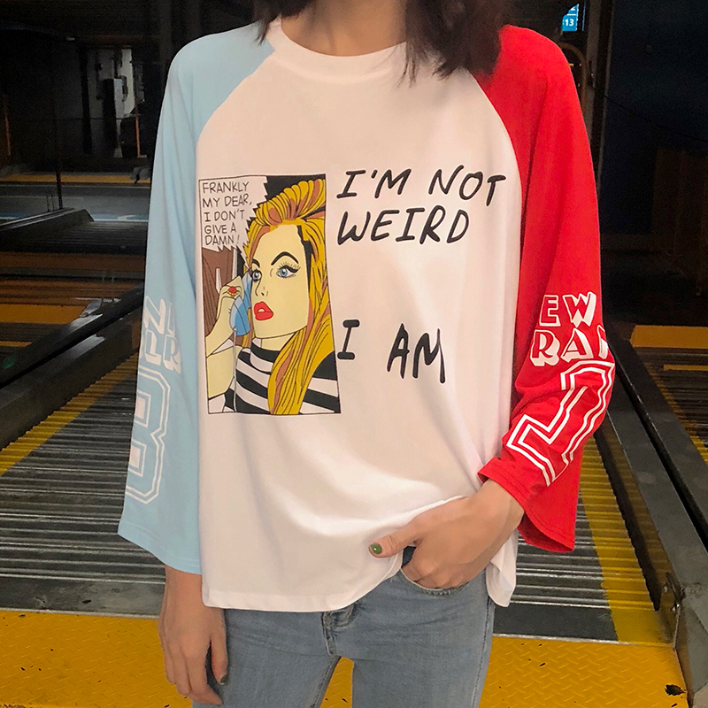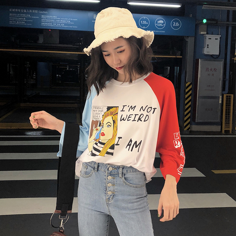 新款秋裝韓版學生寬松個性撞色圓領長袖t恤怪味少女印花潮流上衣