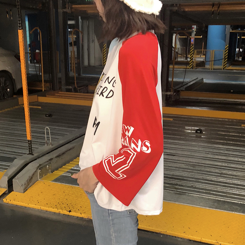 / 新款秋裝韓版學生寬松個性撞色圓領長袖t恤怪味少女印花潮流上衣