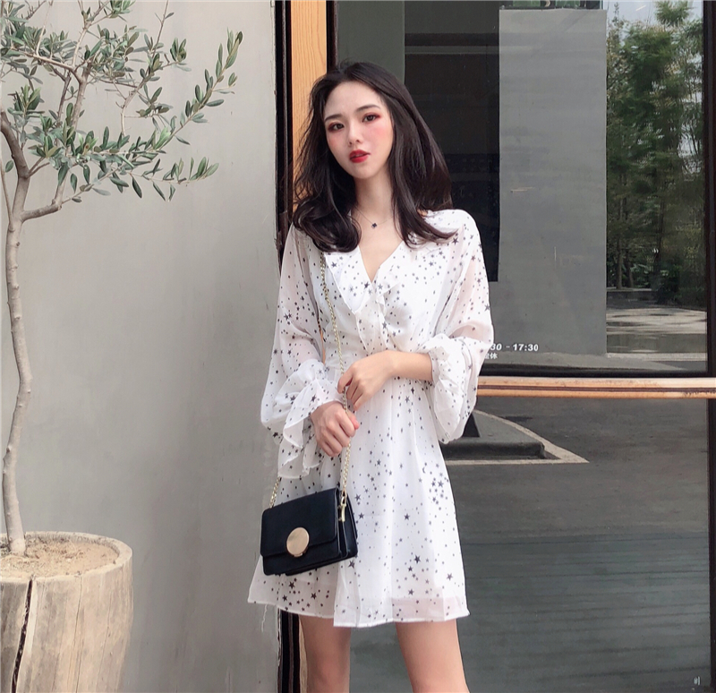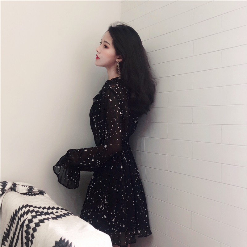 / 早秋新款荷葉邊顯瘦不規則v領收腰甜美氣質時尚星星雪紡連衣裙女