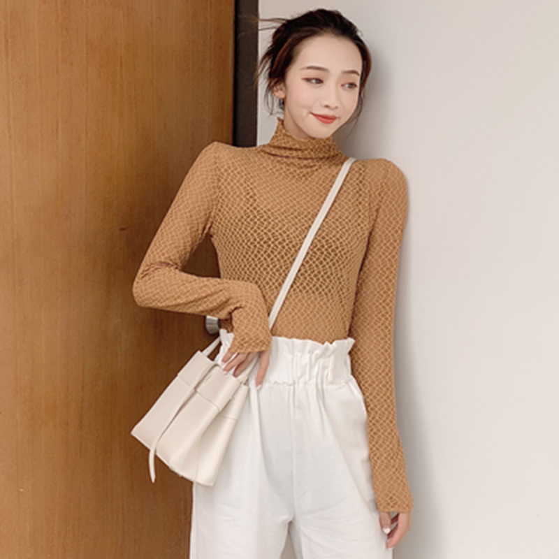 / 洋氣質蕾絲很仙的上衣秋冬季女裝新款時尚透視黑色修身顯瘦打底衫