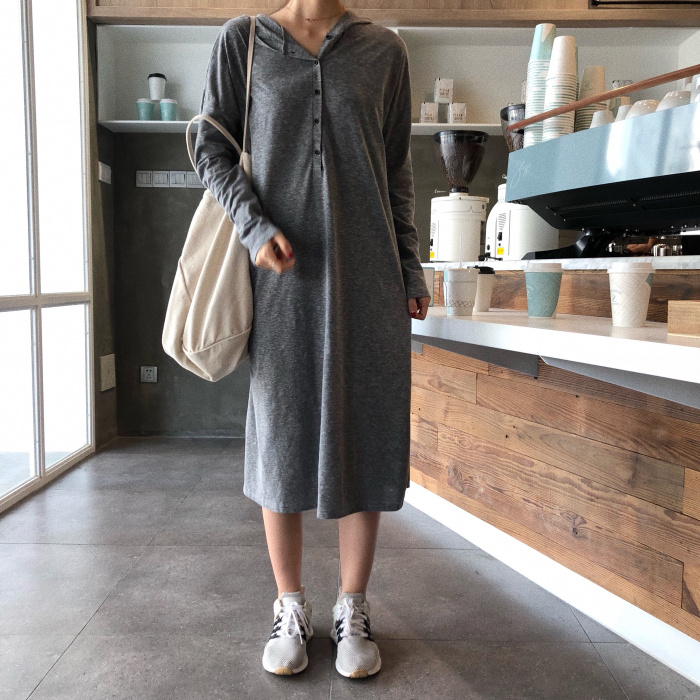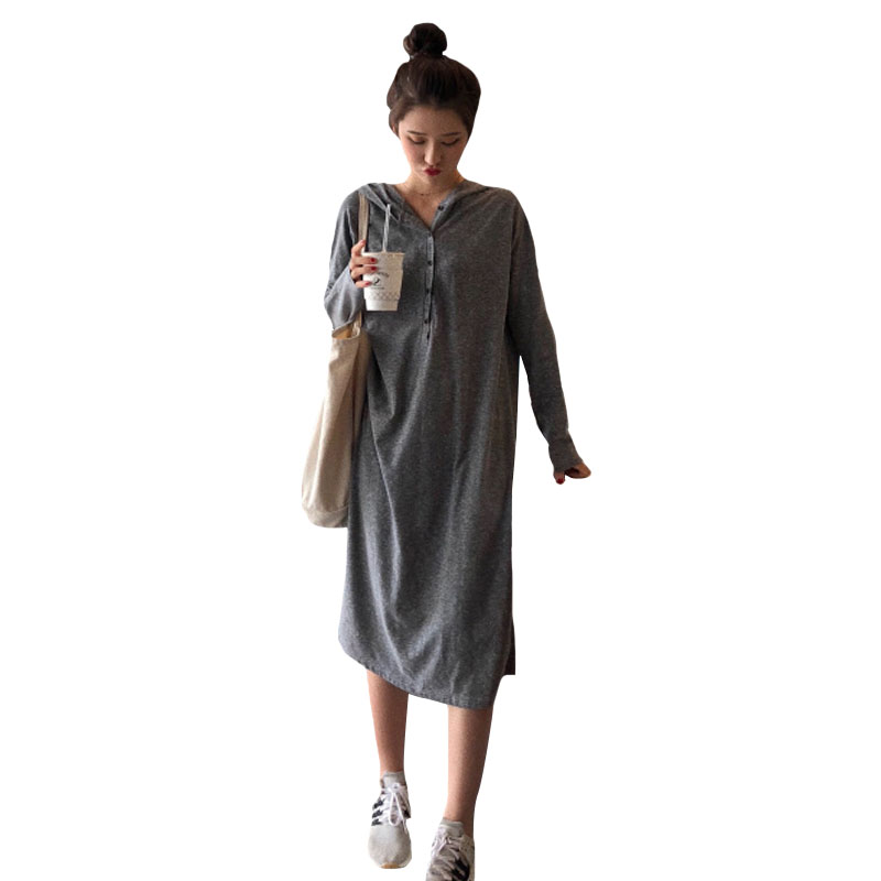 / 秋季女裝韓版寬松長款過膝長袖連帽慵懶風衛衣連衣裙學生顯瘦長裙