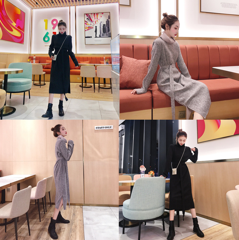 / 2018秋冬新款復古拼色百搭氣質高領打底裙子收腰系帶長裙連衣裙女