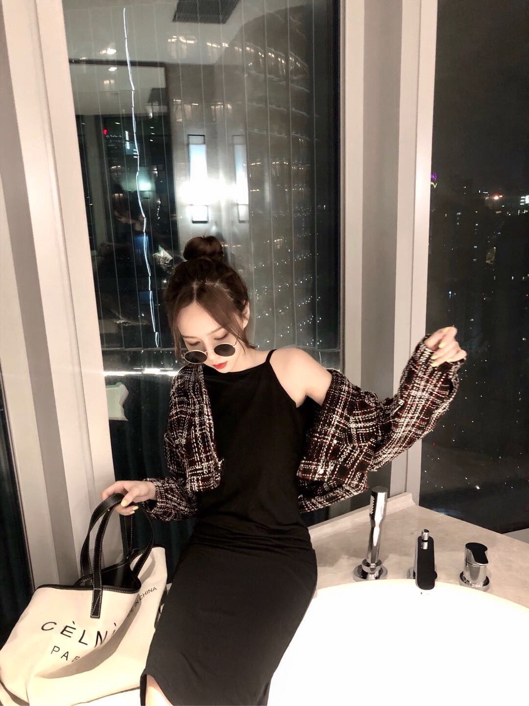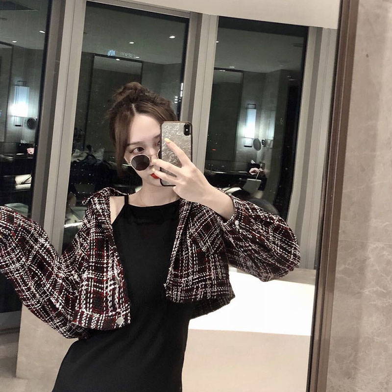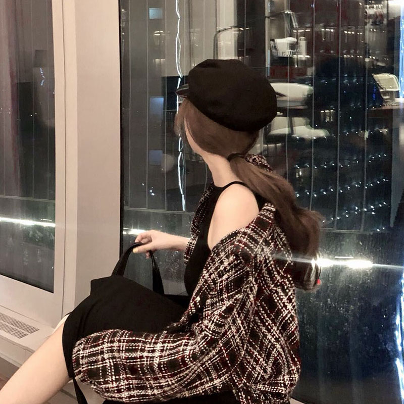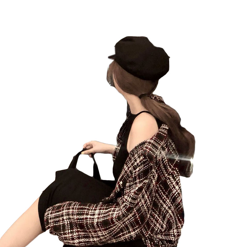 / 秋季套裝女時尚兩件套短款復古格子毛呢外套寬松呢子夾克+吊帶裙