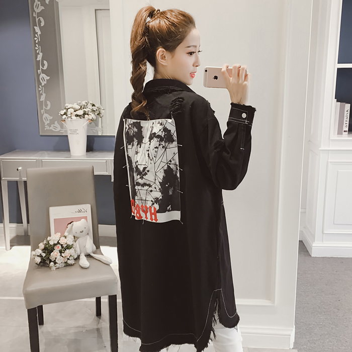 秋裝新款潮韓版時尚寬松BF風長袖風衣百搭破洞中長款牛仔外套女裝