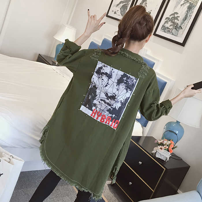 / 秋裝新款潮韓版時尚寬松BF風長袖風衣百搭破洞中長款牛仔外套女裝