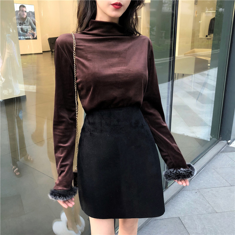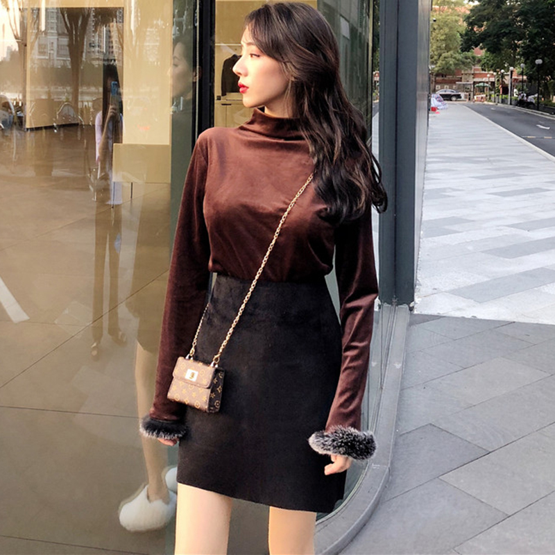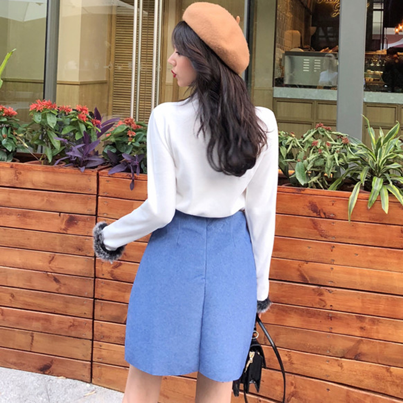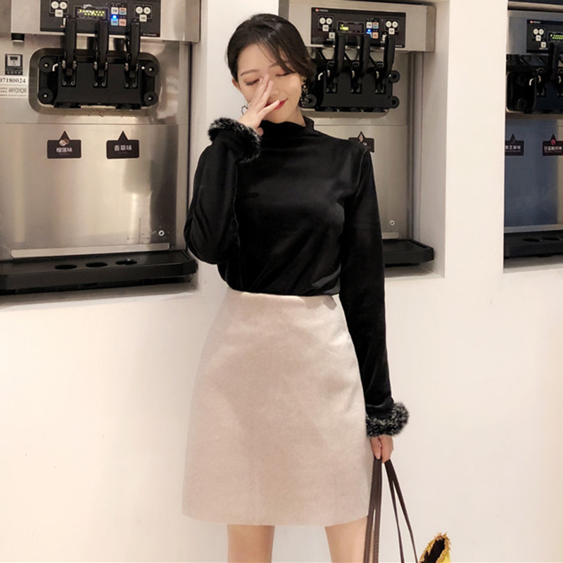 / 赫本風套裝女秋冬新款毛毛袖修身打底衫上衣高腰顯瘦黑色半身裙子