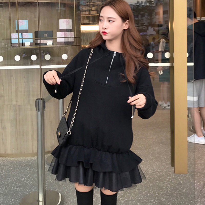 / 秋冬女裝2018新款韓版假兩件網紗拼接荷葉邊魚尾裙寬松連帽衛衣裙