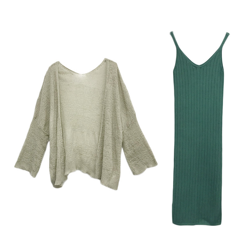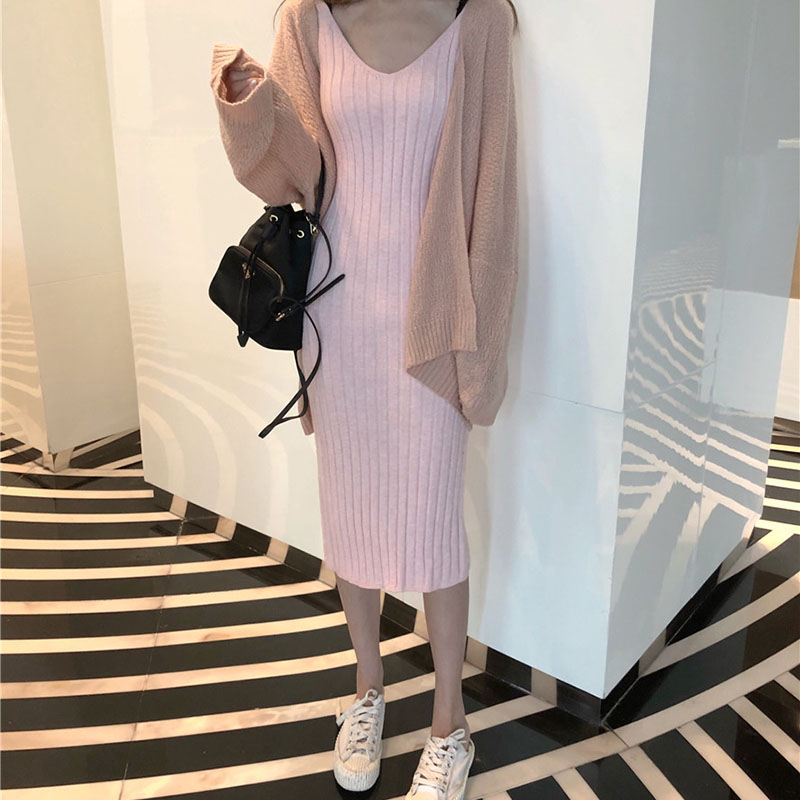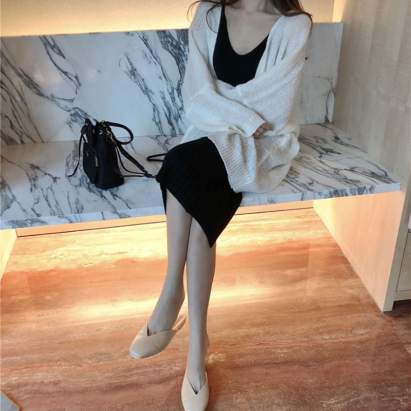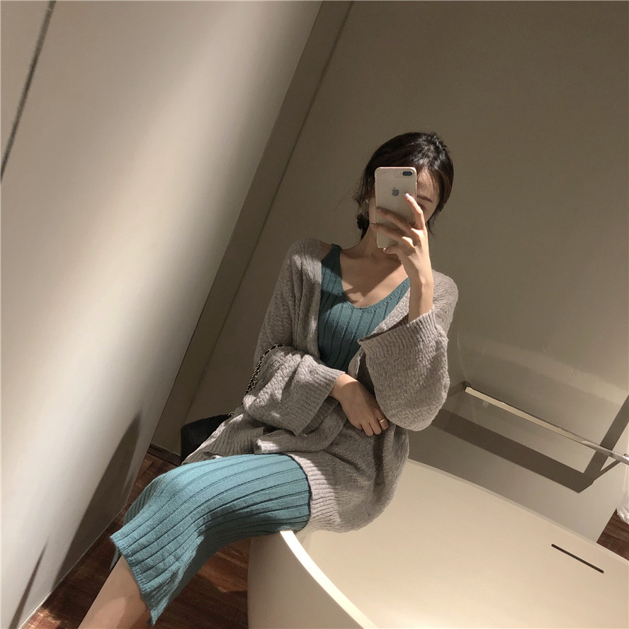 馬海毛網紅毛衣女2018新款針織開衫外套冷淡風針織吊帶連衣裙套裝