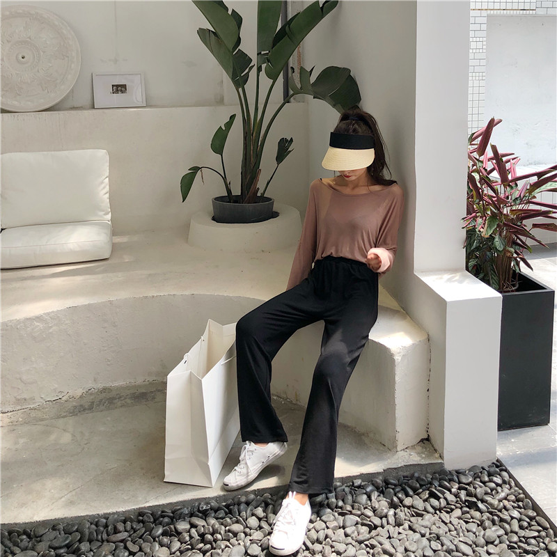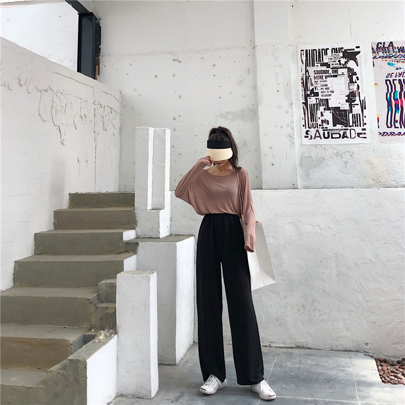 秋裝女2018新款潮流純色夏季顯瘦拖地薄款針織闊腿褲長褲直筒褲子