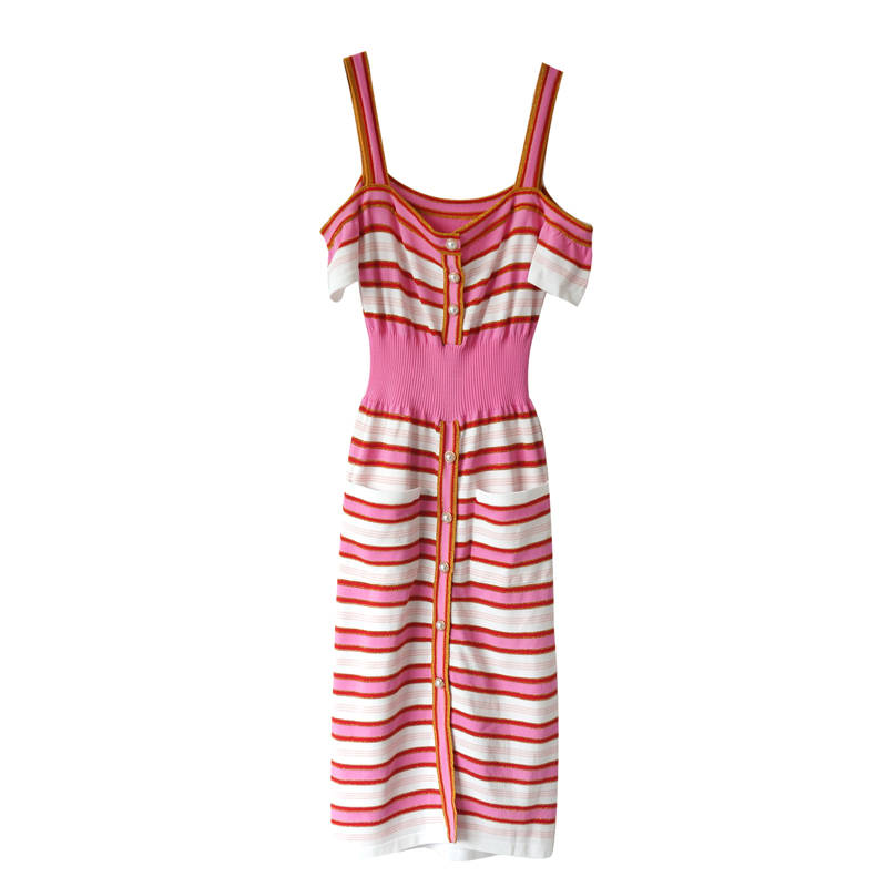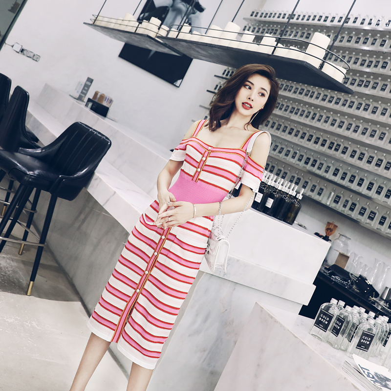 / S秀2018新款時尚吊帶裙一字領針織高腰連衣裙女夏中長裙子潮