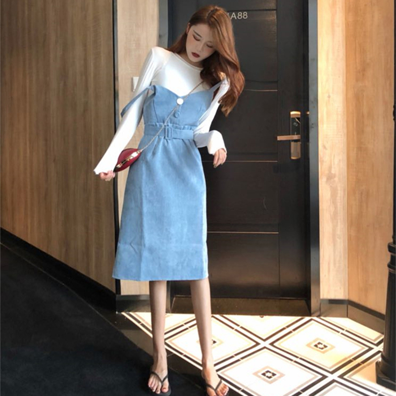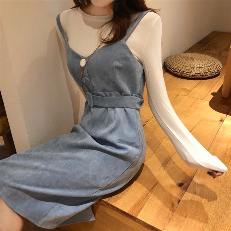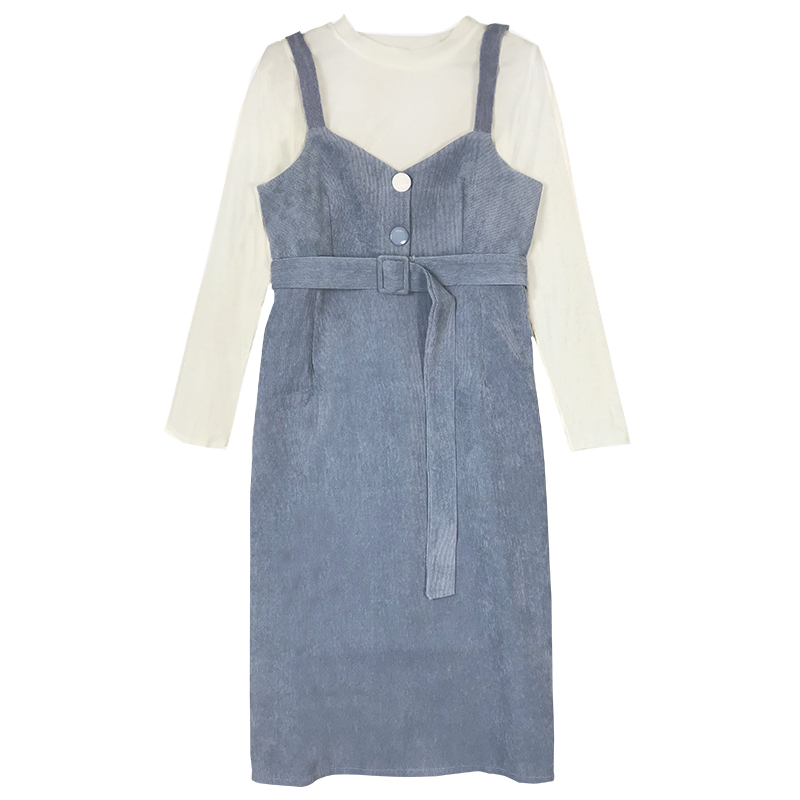 / 韓版時尚套裝女秋新款長袖打底衫T恤上衣+高腰燈芯絨背帶連衣裙子