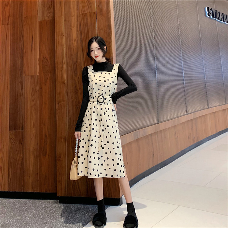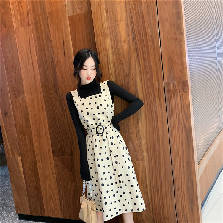韓版秋裝女2018新款套裝半高領T恤女打底衫+呢料波點裙時尚兩件套