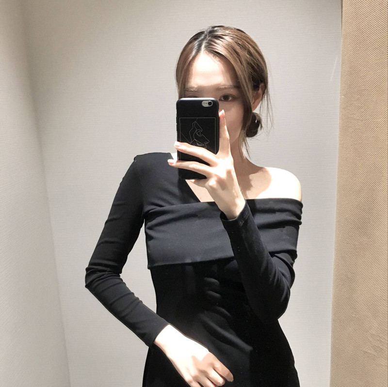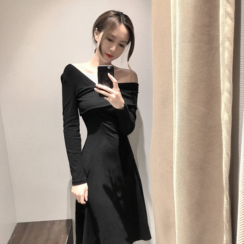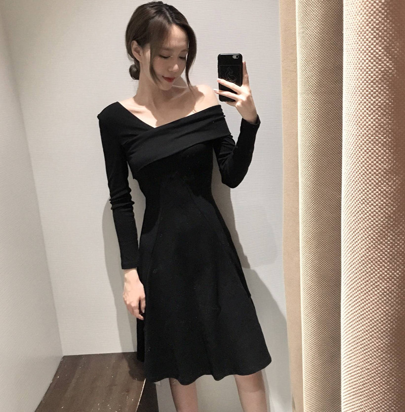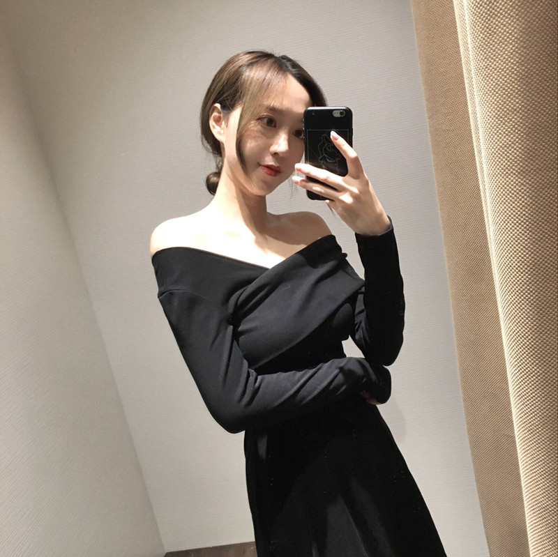 / 2018秋季新品chic性感V領修身露肩顯瘦針織中長款黑色氣質連衣裙