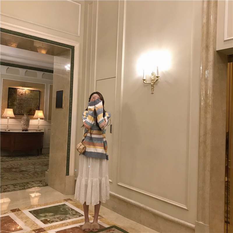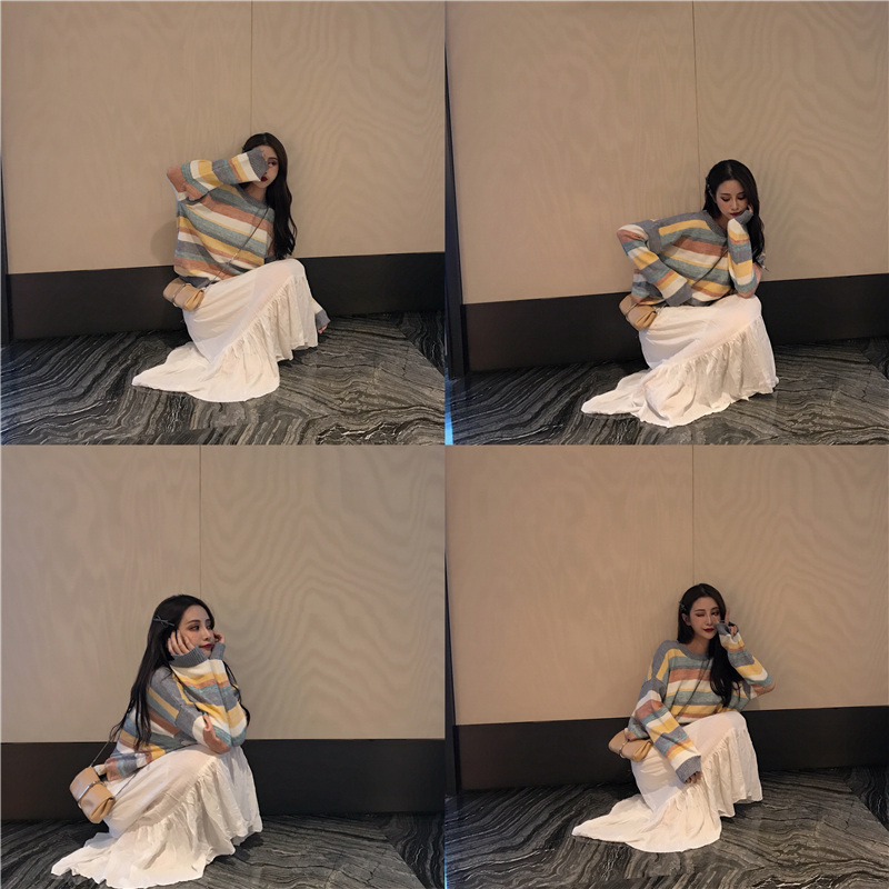 / 復古新款彩虹毛衣小清新雪紡高腰半身裙時尚套裝chic氣質兩件套女