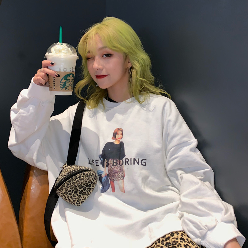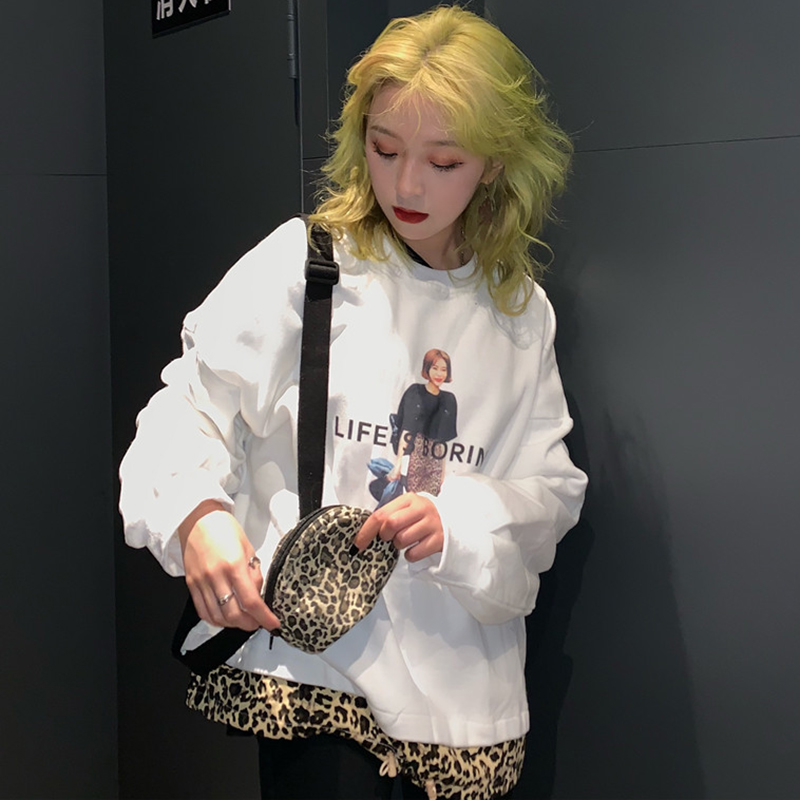 豹紋拼接圓領衛衣2018新款女秋冬裝港風抽繩時尚印花外套學生上衣