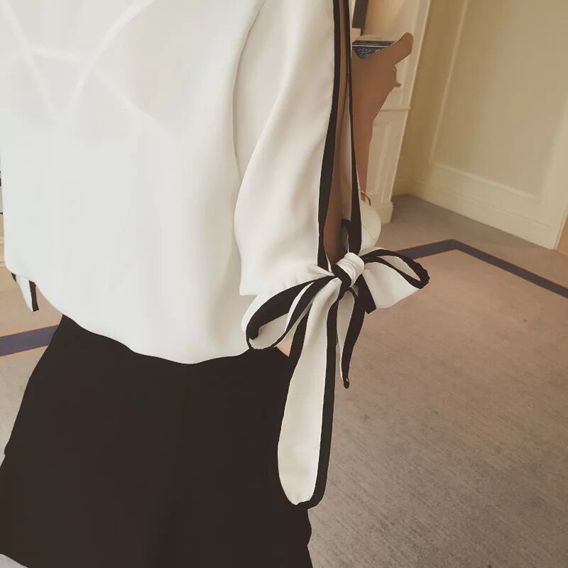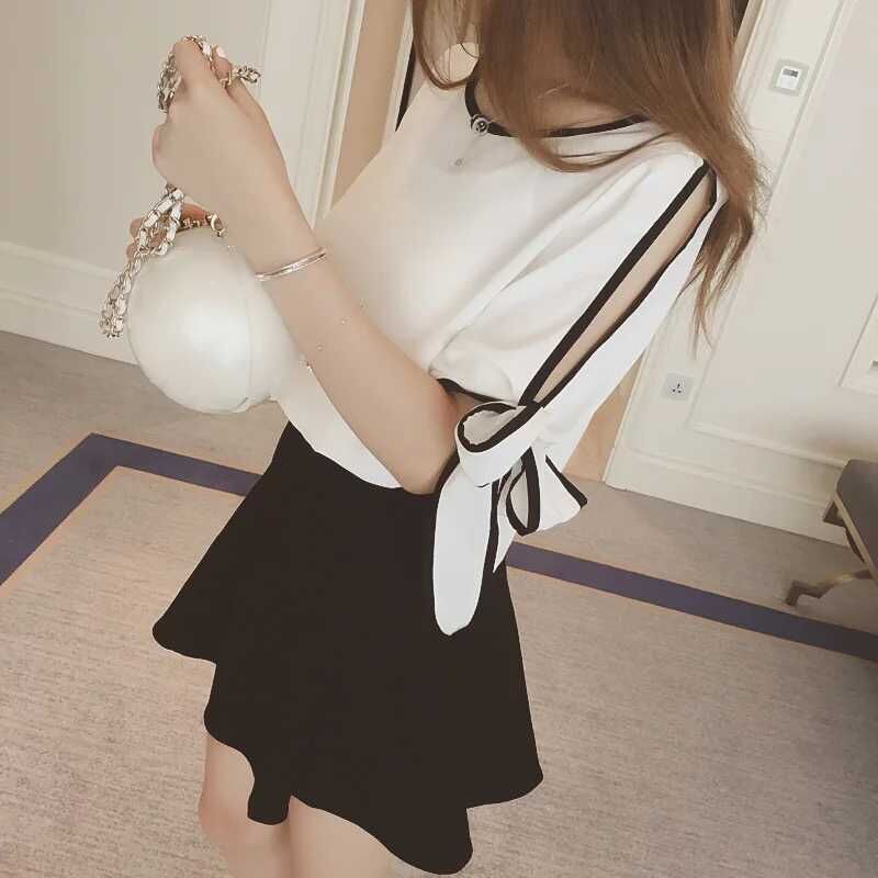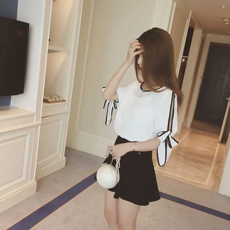 / 春夏天新款韓版女裝氣質圓領露肩蝴蝶結系帶雪紡衫上衣學生衣服潮
