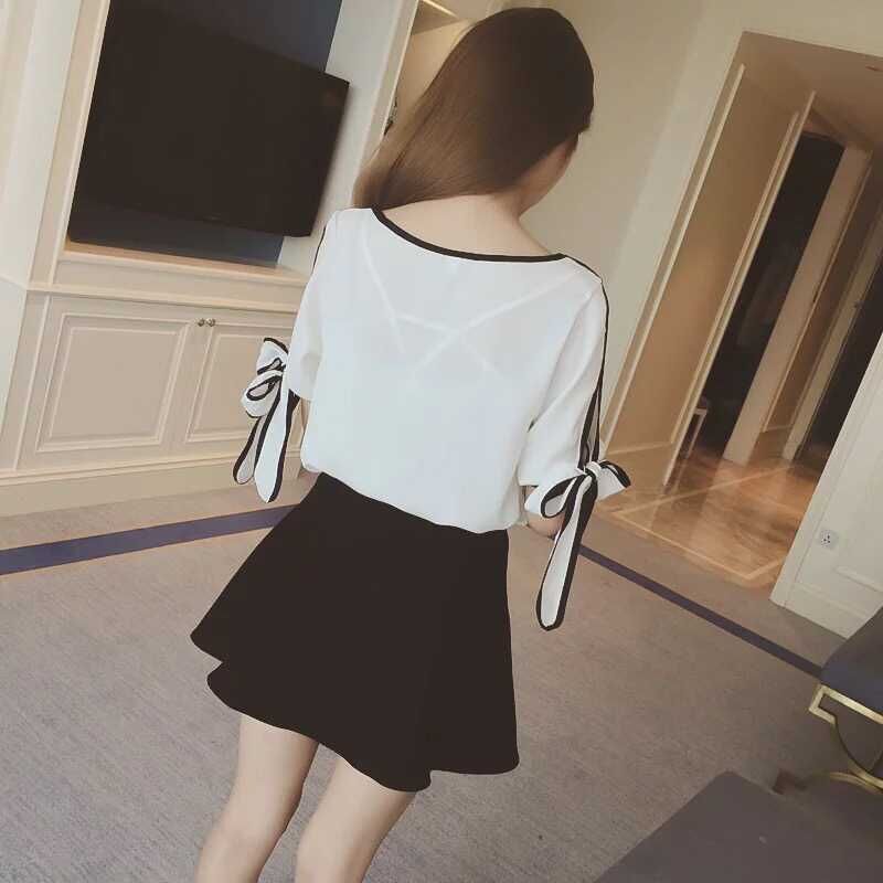春夏天新款韓版女裝氣質圓領露肩蝴蝶結系帶雪紡衫上衣學生衣服潮