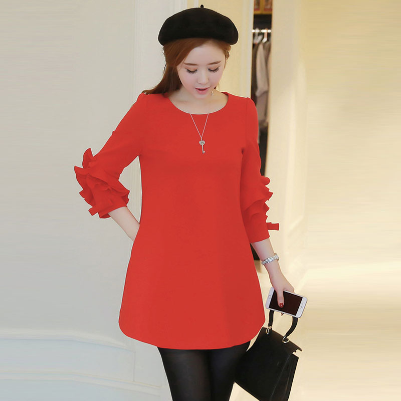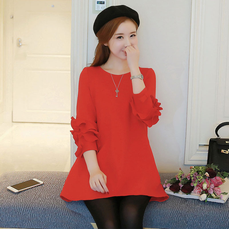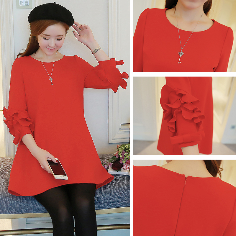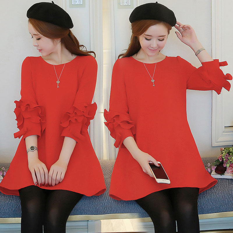 / 春季新款女裝大碼寬松顯瘦a型娃娃裙蝴蝶結花瓣七分袖連衣裙