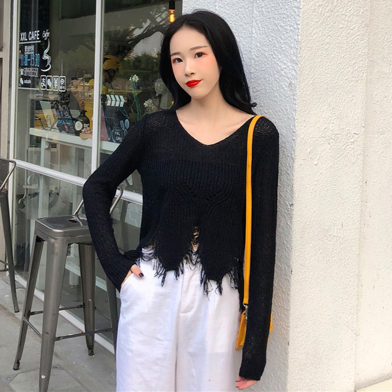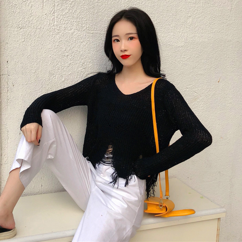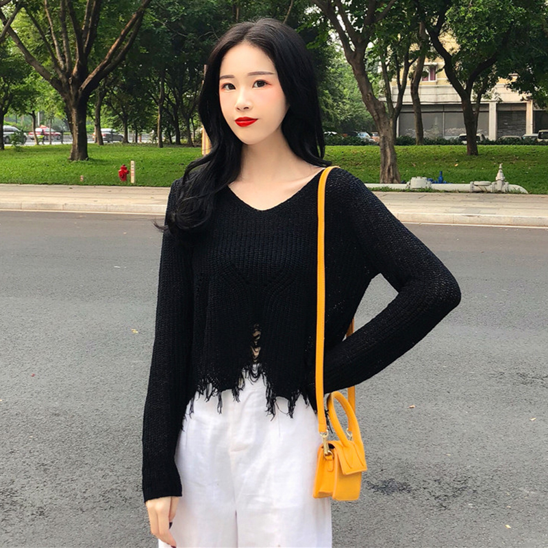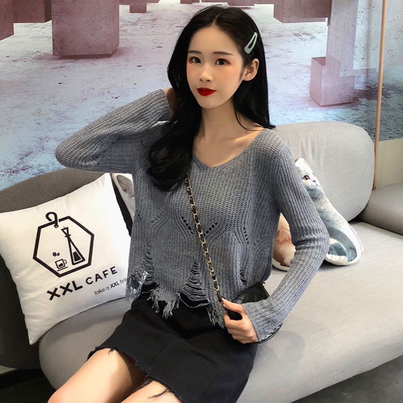 v領毛衣女秋冬裝2018新款學生慵懶套頭長袖不規則流蘇短款針織衫