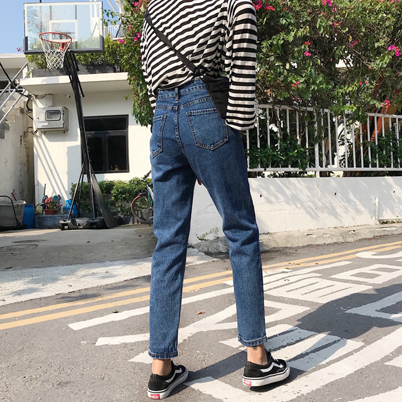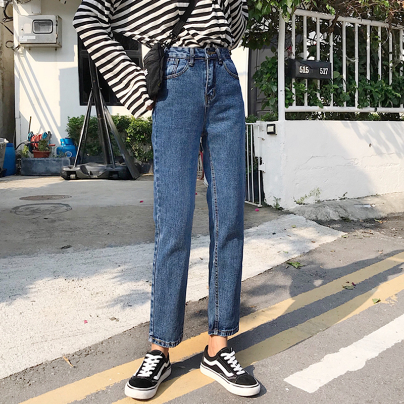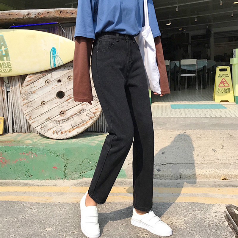 休閑高腰牛仔褲秋裝女2018新款韓版時尚九分褲學生寬松直筒黑褲子