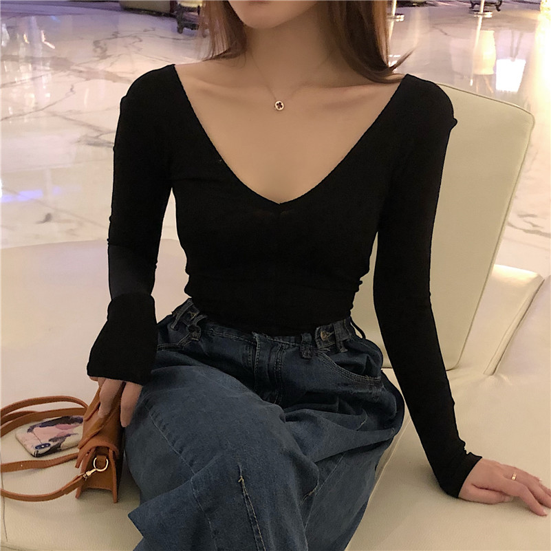 / 港風新款韓版復古風深V領上衣女氣質百搭純色長袖修身顯瘦打底T恤