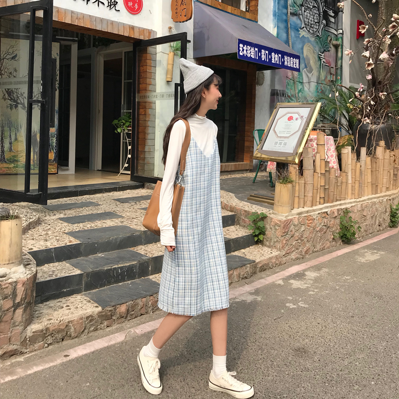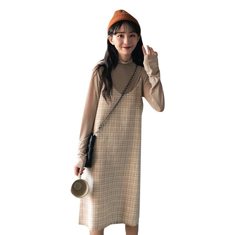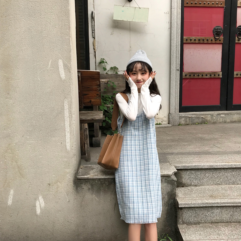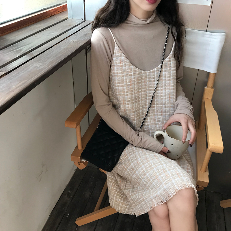 / 韓版時尚休閑套裝秋季女裝打底長袖針織衫+格子吊帶連衣裙兩件套