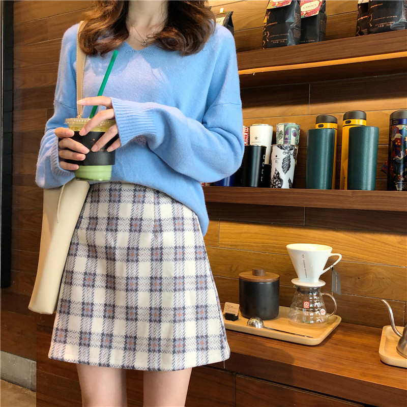 / 韓版時尚休閑套裝秋季慵懶風V領毛衣外套+高腰格子半身裙兩件套女