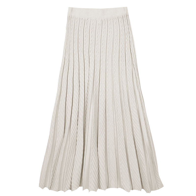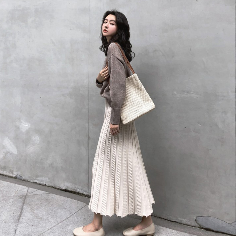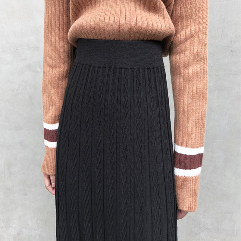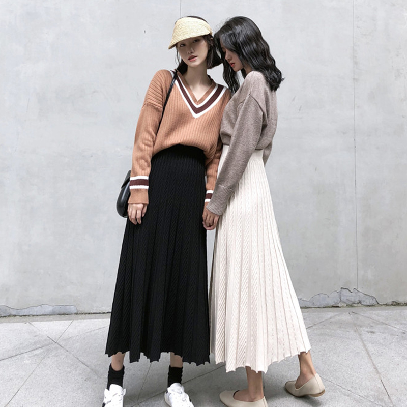 / 黑色A字中長裙子秋裝女2018新款韓版學生高腰褶皺針織半身大擺裙