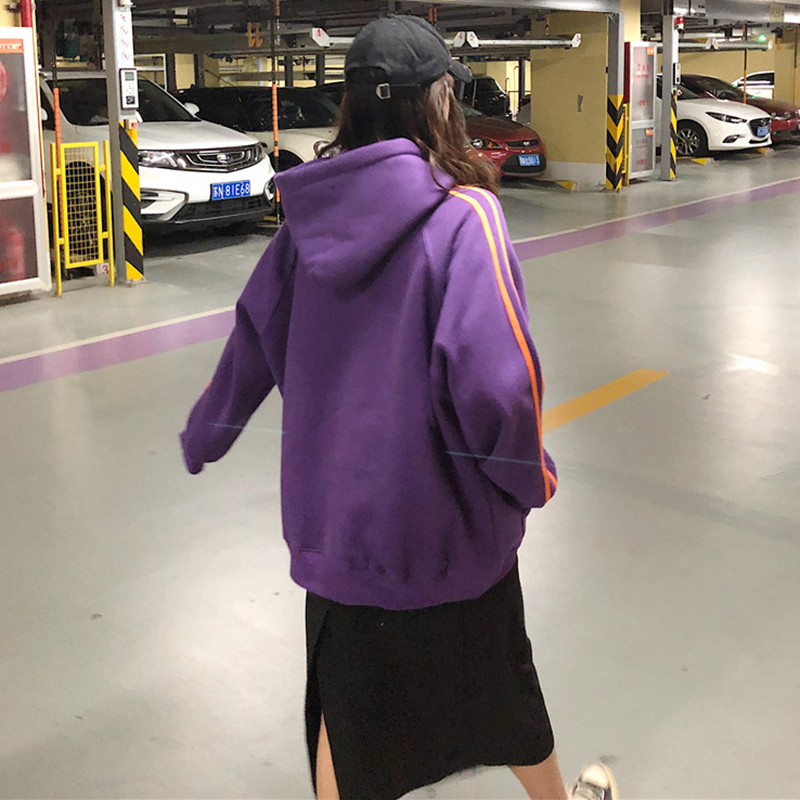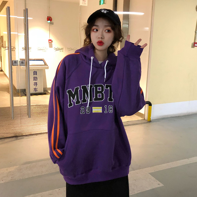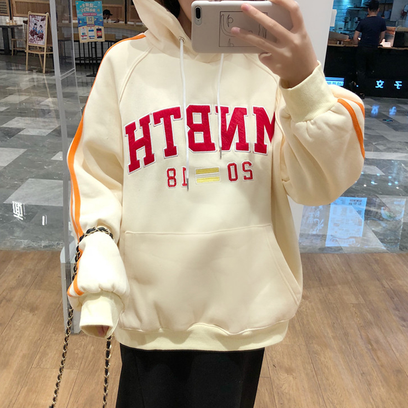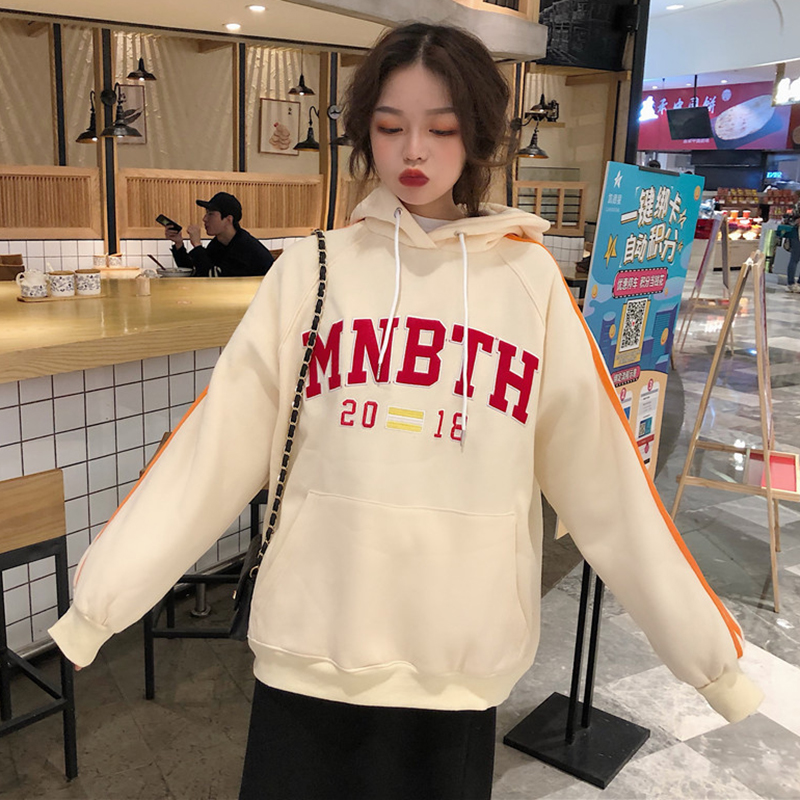 / 秋冬女裝2018新款韓版杠條拼色加絨衛衣學生寬松字母刺繡連帽外套