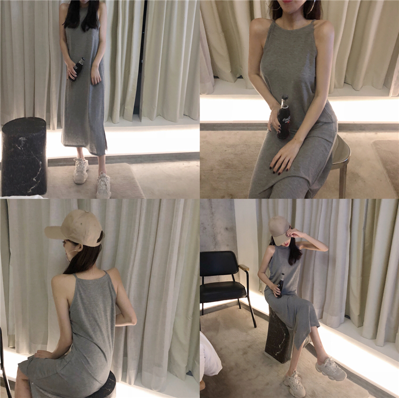 / 韓版時尚性感慵懶吊帶連衣裙女夏2018新款開叉修身顯瘦長裙一步裙