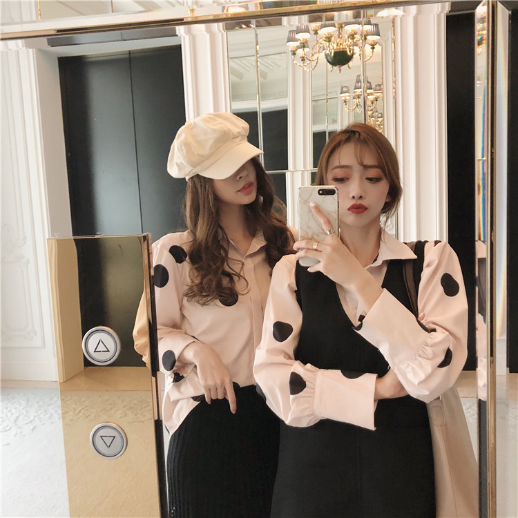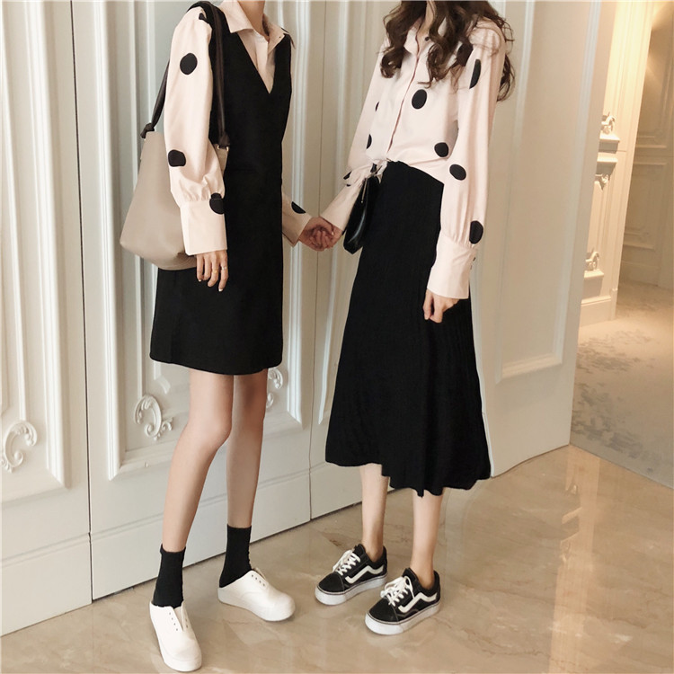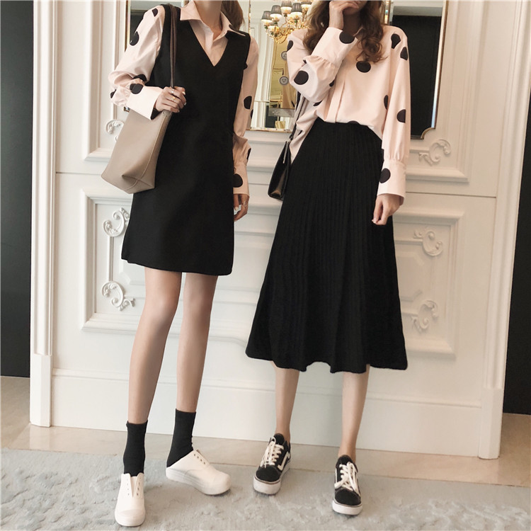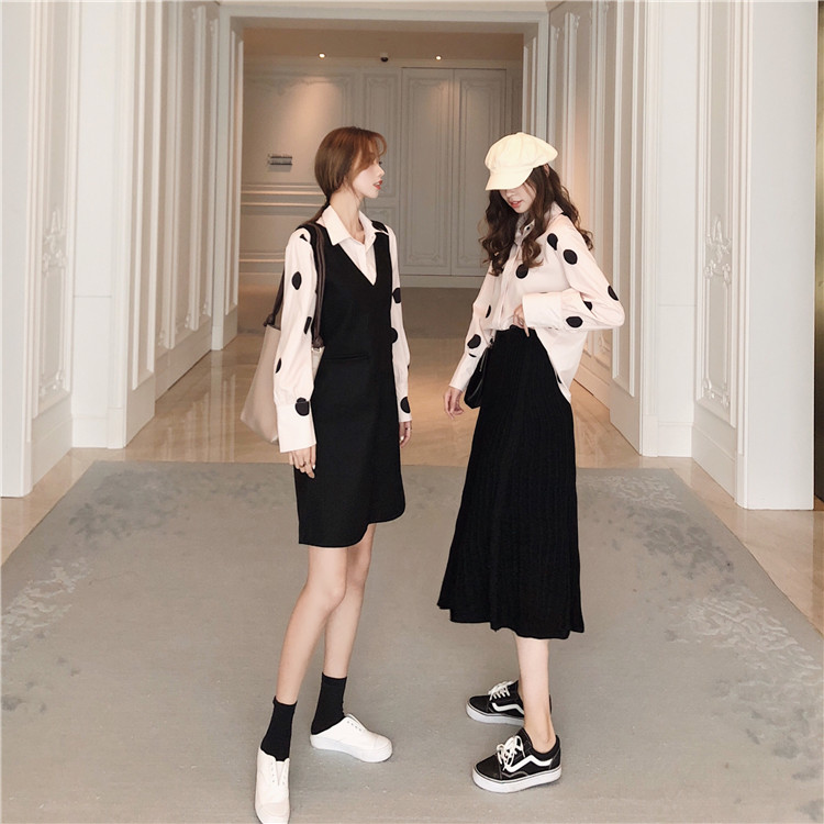 / 秋裝女2018新款套裝閨蜜裝波點百搭寬松襯衣+毛呢背心裙+百褶裙女