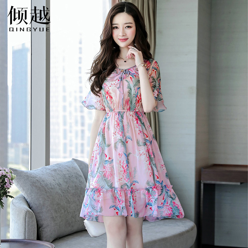 / 2017碎花雪紡連衣裙女夏裝新款氣質韓國v領喇叭袖荷葉邊裙子顯瘦